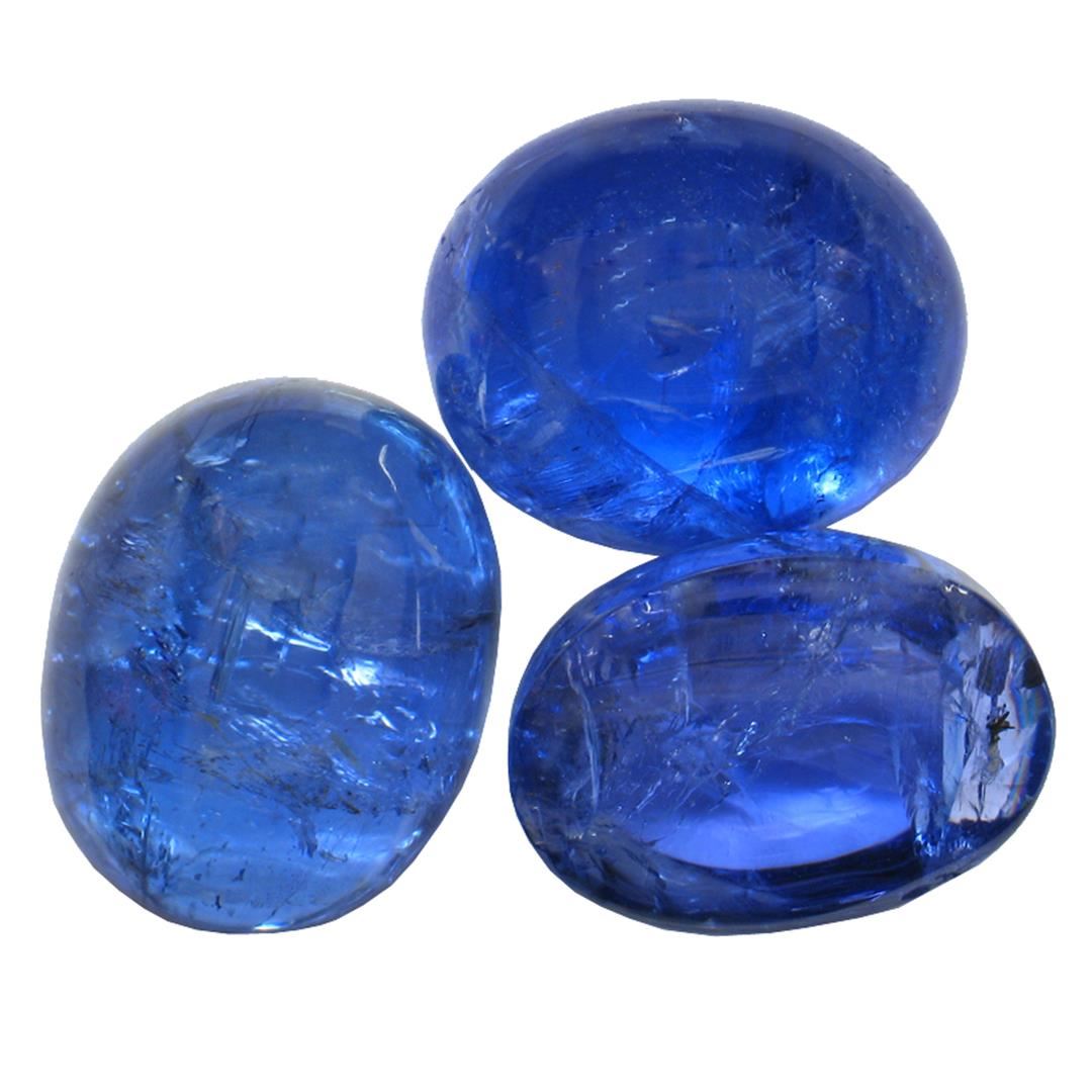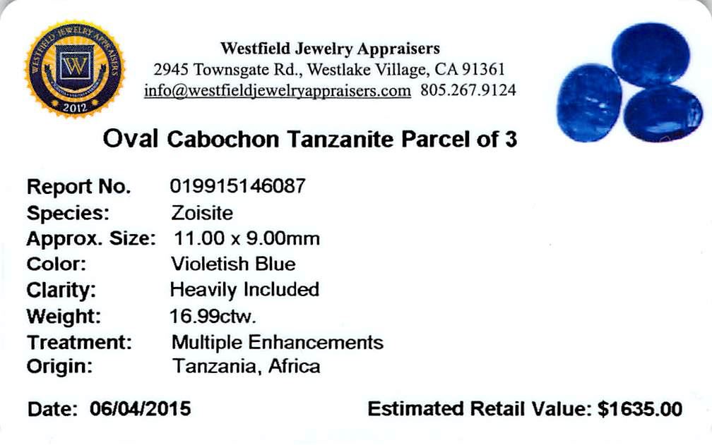 Three oval cabochon cut natural tanzanites, measuring 11.00 x 9.00 x 5.85mm, exact total weight 16.99ct., clarity is heavily included, type I, dark, moderately strong, violetish blue color, (GIA vB 7/4), cut is good. Transmitting light somewhat diffusely, transparent to translucent. Naturally occurring internal & external characteristics are present. Color grade is an average for the group. Westfield Appraised at $1,635.00.