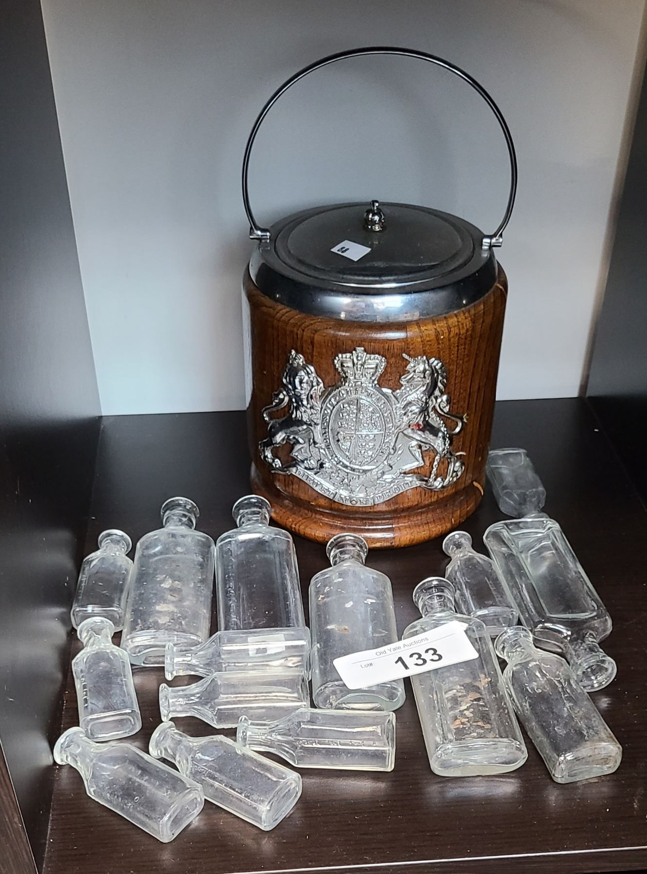 16 ANTIQUE APOTHECARY BOTTLES & BISCUIT BARREL
