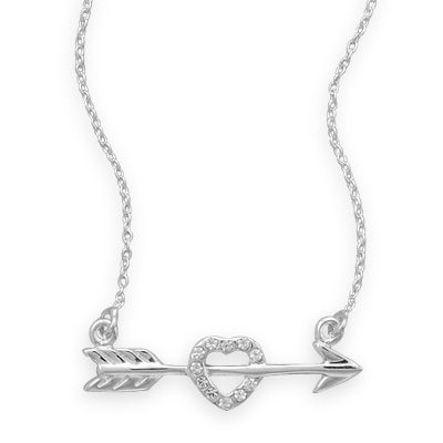 16" sterling silver necklace with an arrow through a CZ heart pendant. The arrow is approximately 5mm x 31mm. The heart is approximately 9mm. This necklace has a spring ring closure. .925 Sterling Silver
