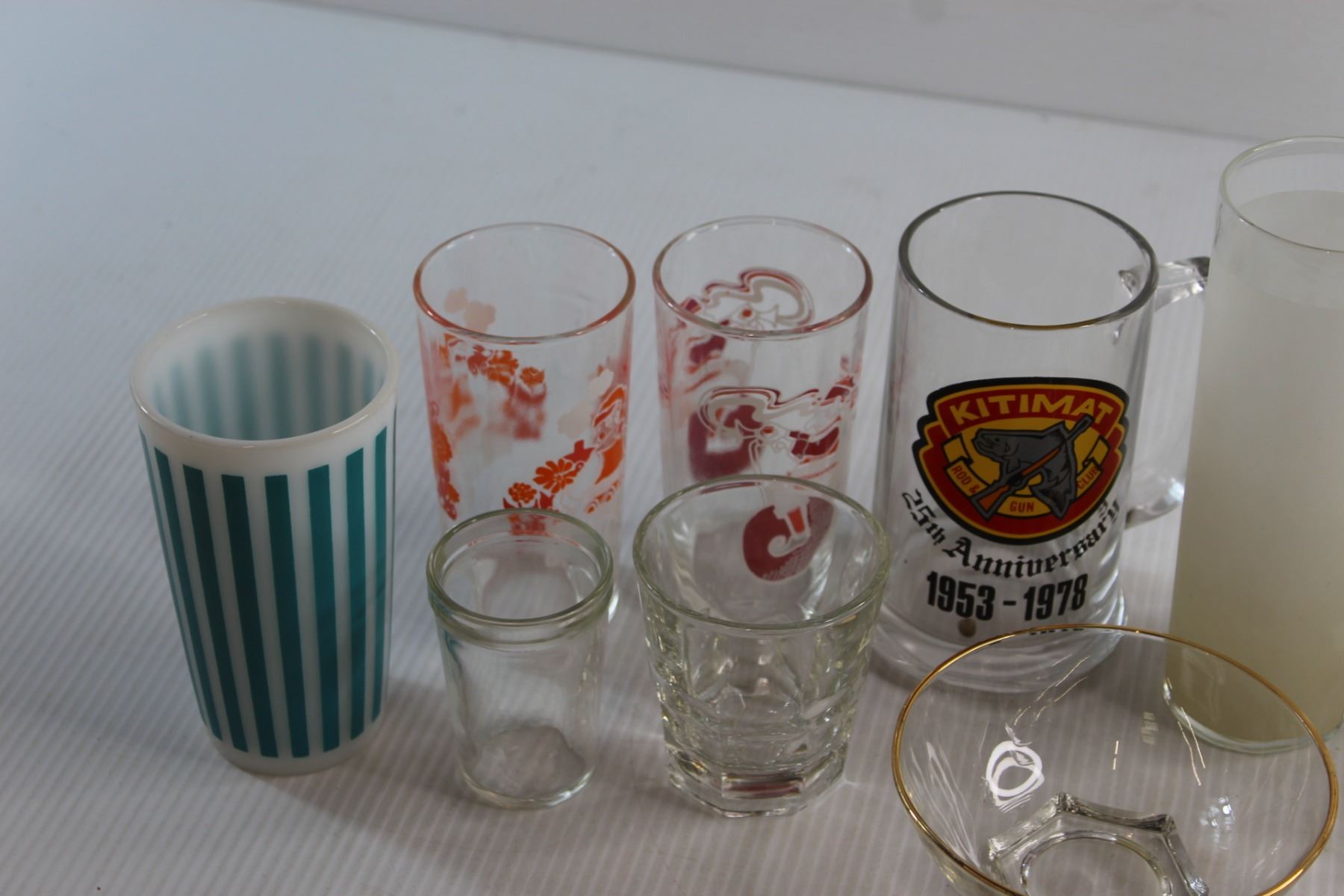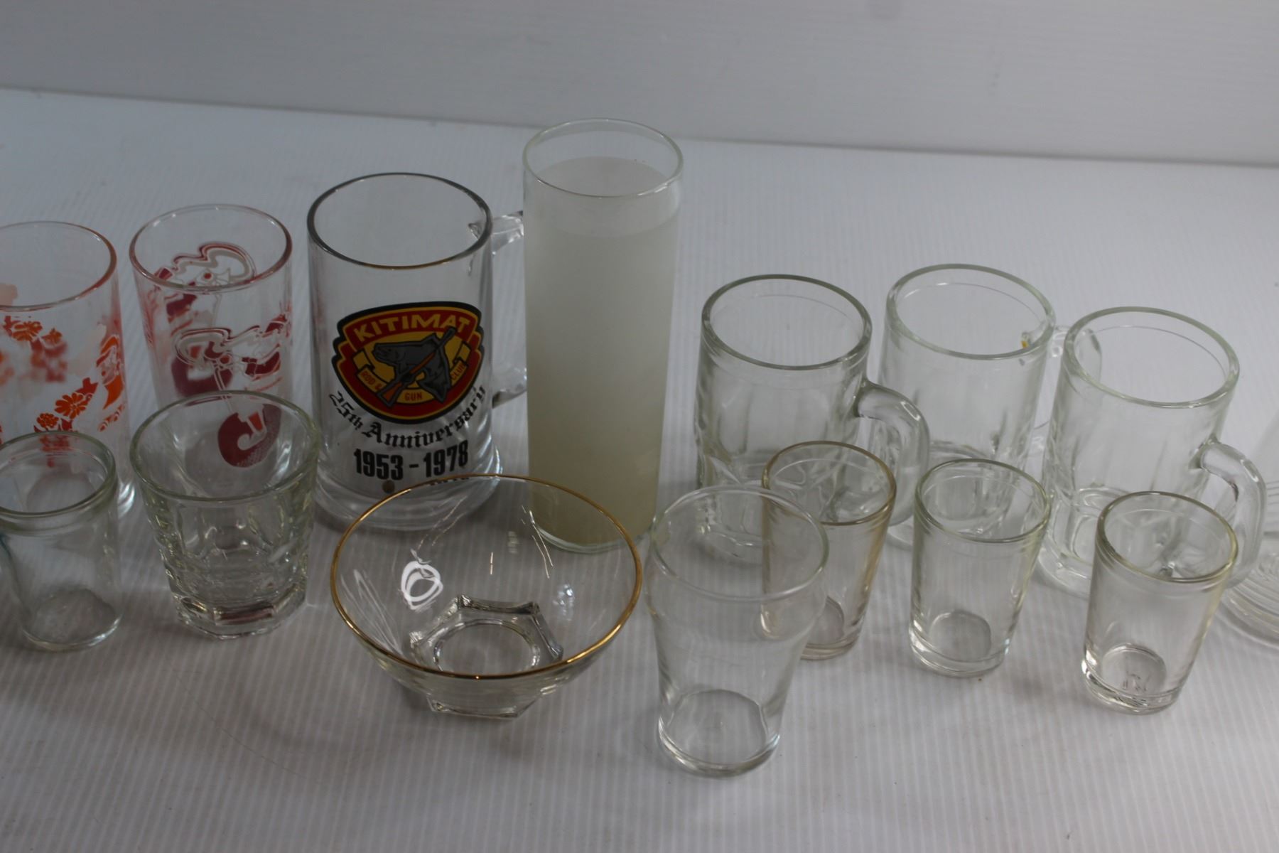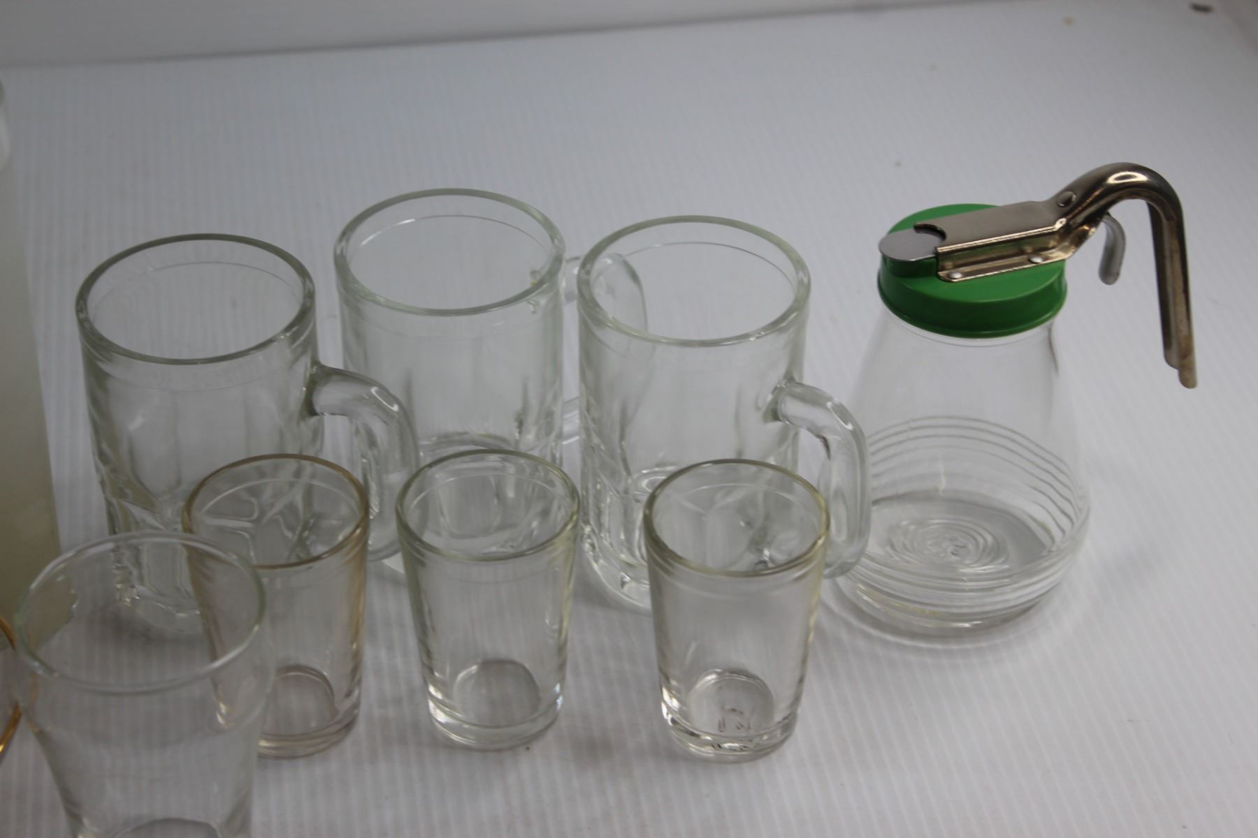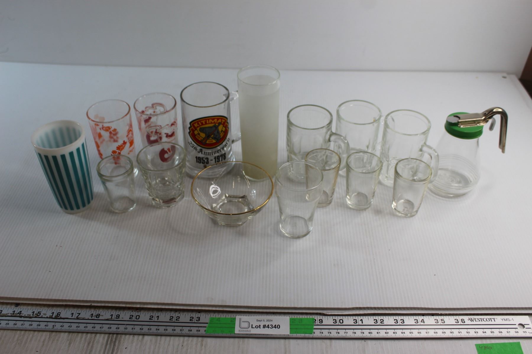 (16) Assorted Glasses, Mugs, Shots, Pitcher and Bowl