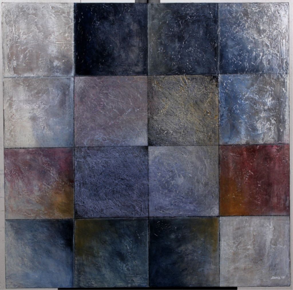 This is an original work of art done in 1997 that features 16 uniquely painted abstract squares. This is an Acrylic China Marker and Graphite artwork on stretched canvas. Ron Davis is a Montana Native artist and painted this work while living in Pony, Mt. Ron has since passed away and made wonderful works of art ranging from Abstract, Surreal, Impressionist, and commercial art. His works are in many galleries across the South West and Montana regions. Very Collectible artist. This is signed in the art on lower left and signed on the reverse. The canvas artwork measures 33"x33" and 2" deep.