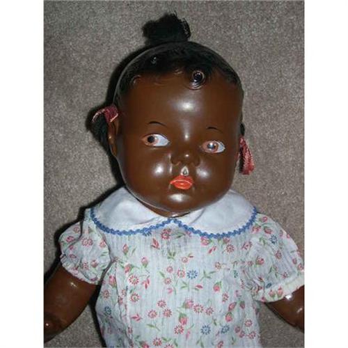 16" Black Unmarked Toddler Strung Doll. Head, arms, and legs move.Doll has original thin black string for tufts. Left shoe has slight separation in front. Cute old dress. Doll comes from a smoke free environment. Buyer to pay $20 for shipping, handling, and insurance. Thanks for viewing.