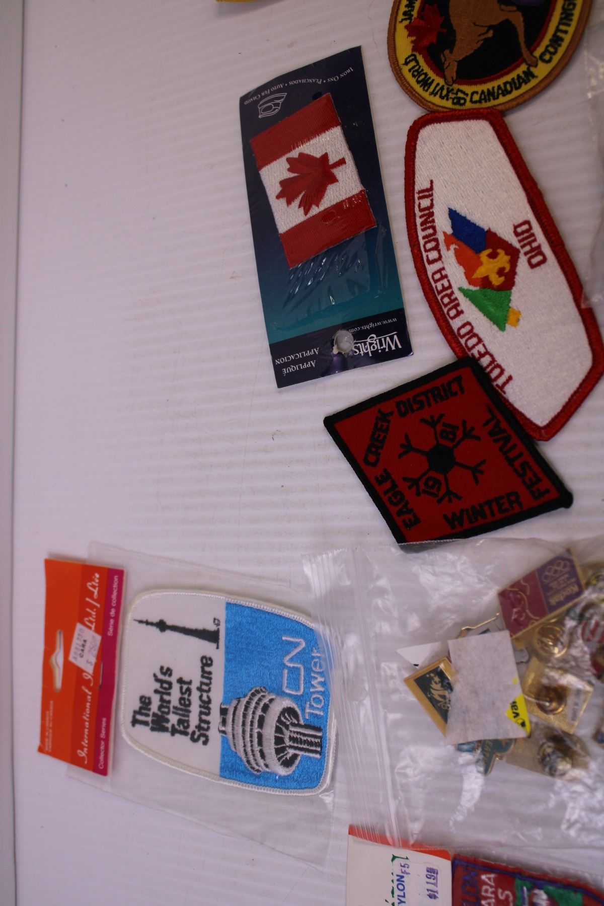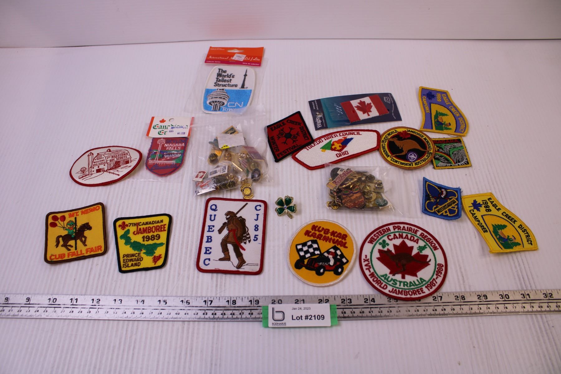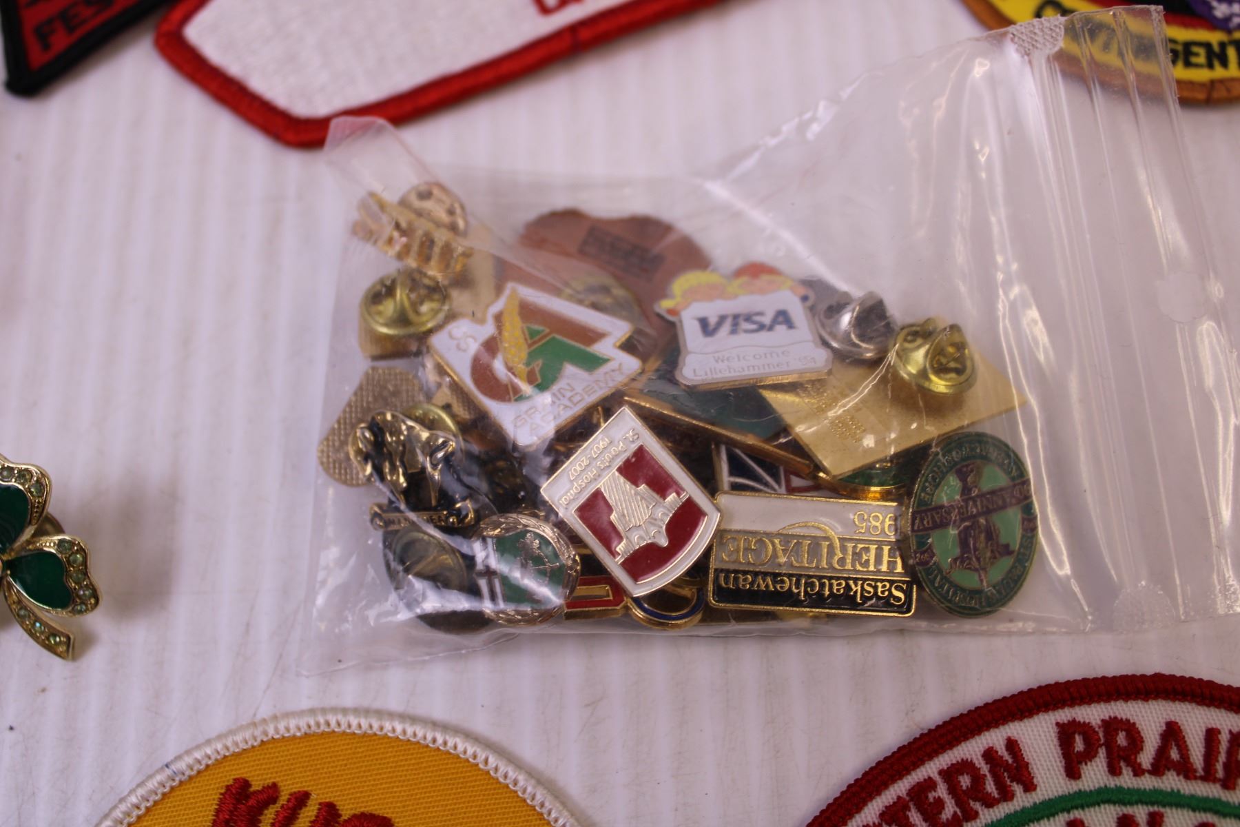 (16) Canada Themed Patches and (2) Bags of Assorted Pins (Canadian Sports events and Provincial Pins)