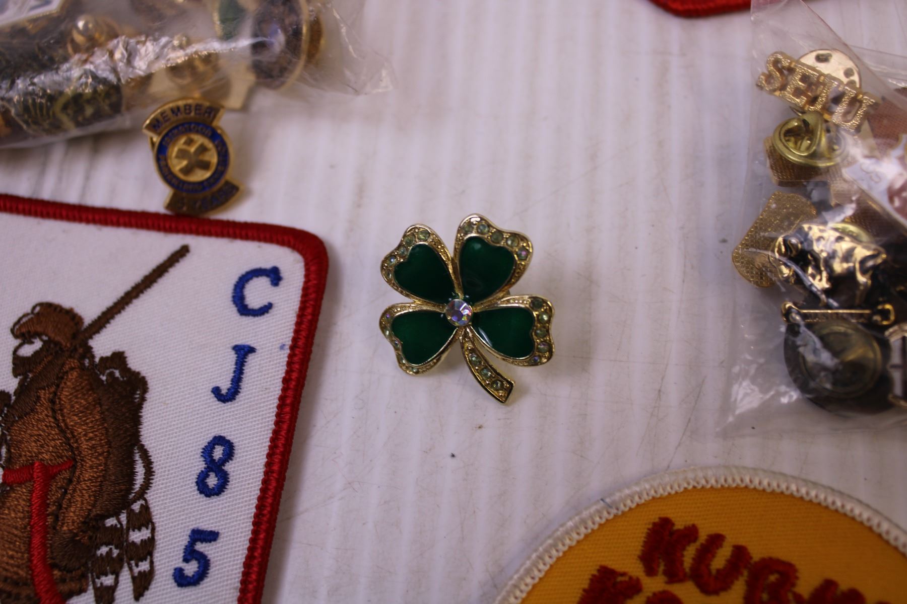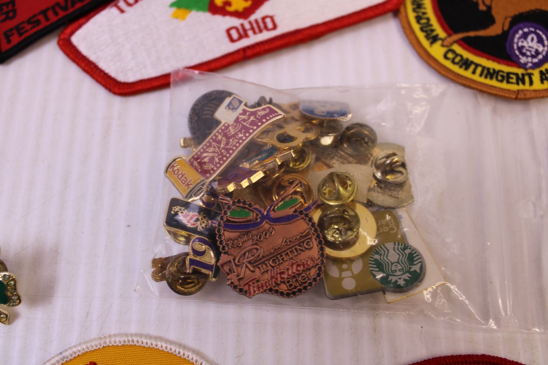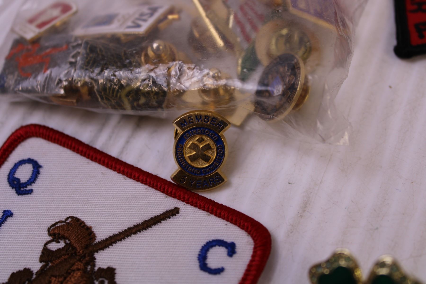 (16) Canada Themed Patches and (2) Bags of Assorted Pins (Canadian Sports events and Provincial Pins)