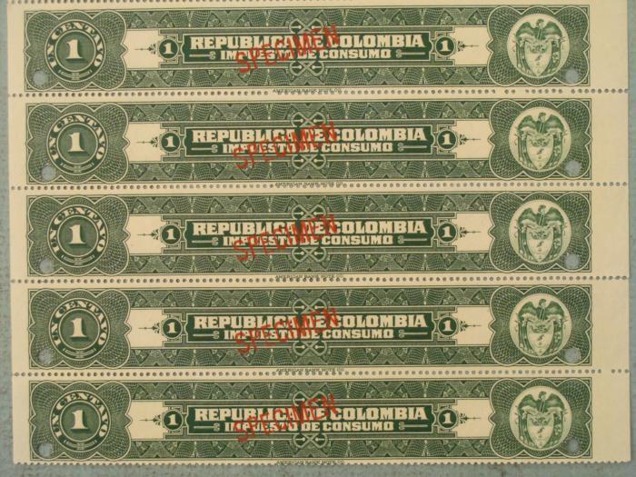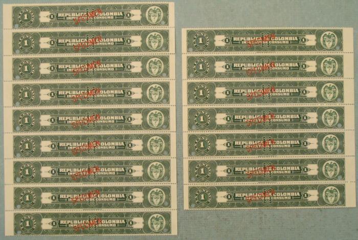 This is a plate block of (16) 1 Centavos tax stamps (in 2 separate sections) from Republic De Colombia, marked "IMPUESTO DE CONSUMO." Each has a red "SPECIMEN" overprint and security punch. They are marked "American Bank Note Co." They have no gum, and are unused, in very good condition.