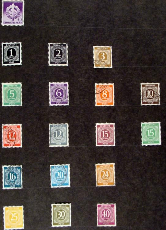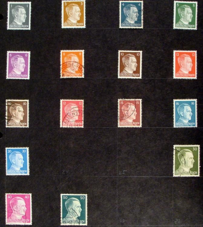 Here are 34 different German stamps dating from around the WWII period. There 16 Hitler stamps in denominations from 1-50. At least 8 are used, with postmarks showing, and the rest appear to be unused. They ome pasted on a sheet. The opposite side of the * sheet has 18 Deutsche Post stamps in denominations from 1-40, plus one Deutsches Reich 6 stamp from 1942. All are in very good condition.
