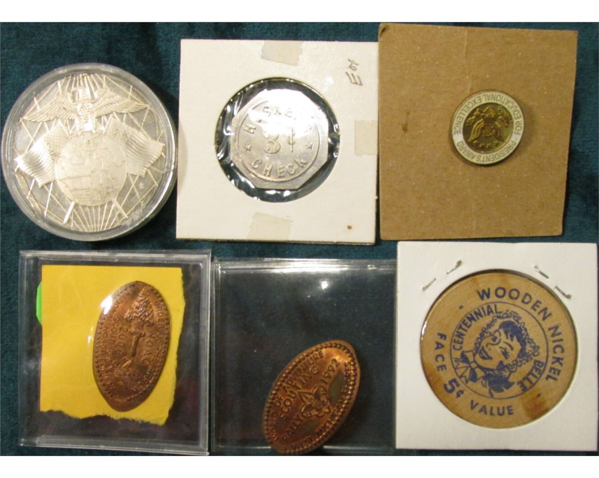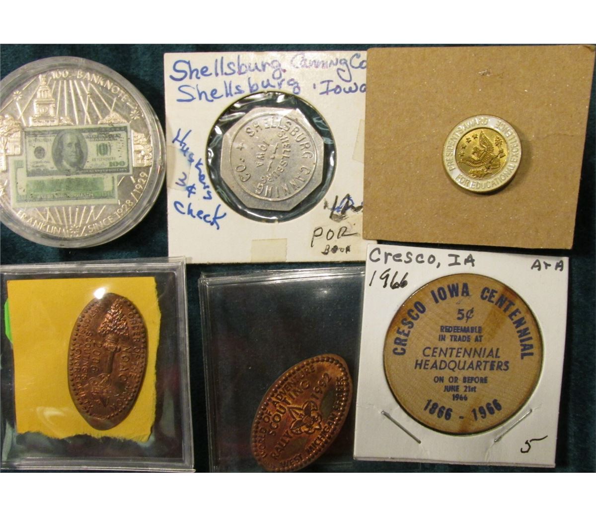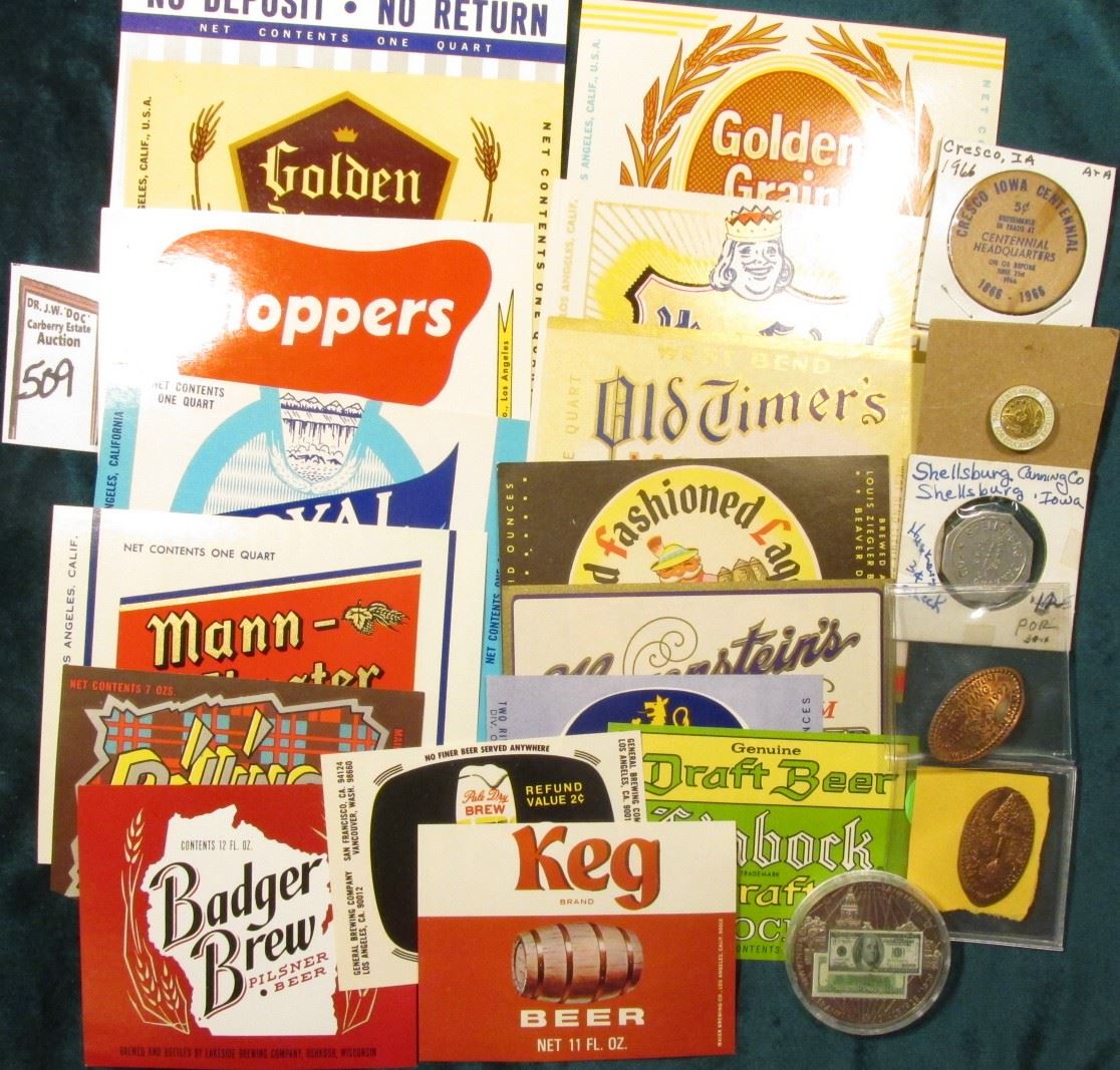 (16) Different Beer Bottle Labels in mint condition; "Presidential Award For Educational Excellence"; 1866-1966 Cresco, Ia. Centennial Wooden Nickel; "Shellsburg Canning Co." 3c Check; "Order of the Arrow 2006" Elongated Cent; "World of Adventure Scouting Rally 1992 West Michigan Shores"; & $100 Banknote Benjamin Franklin encased medal.