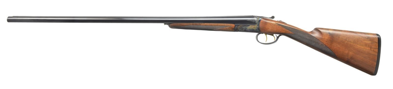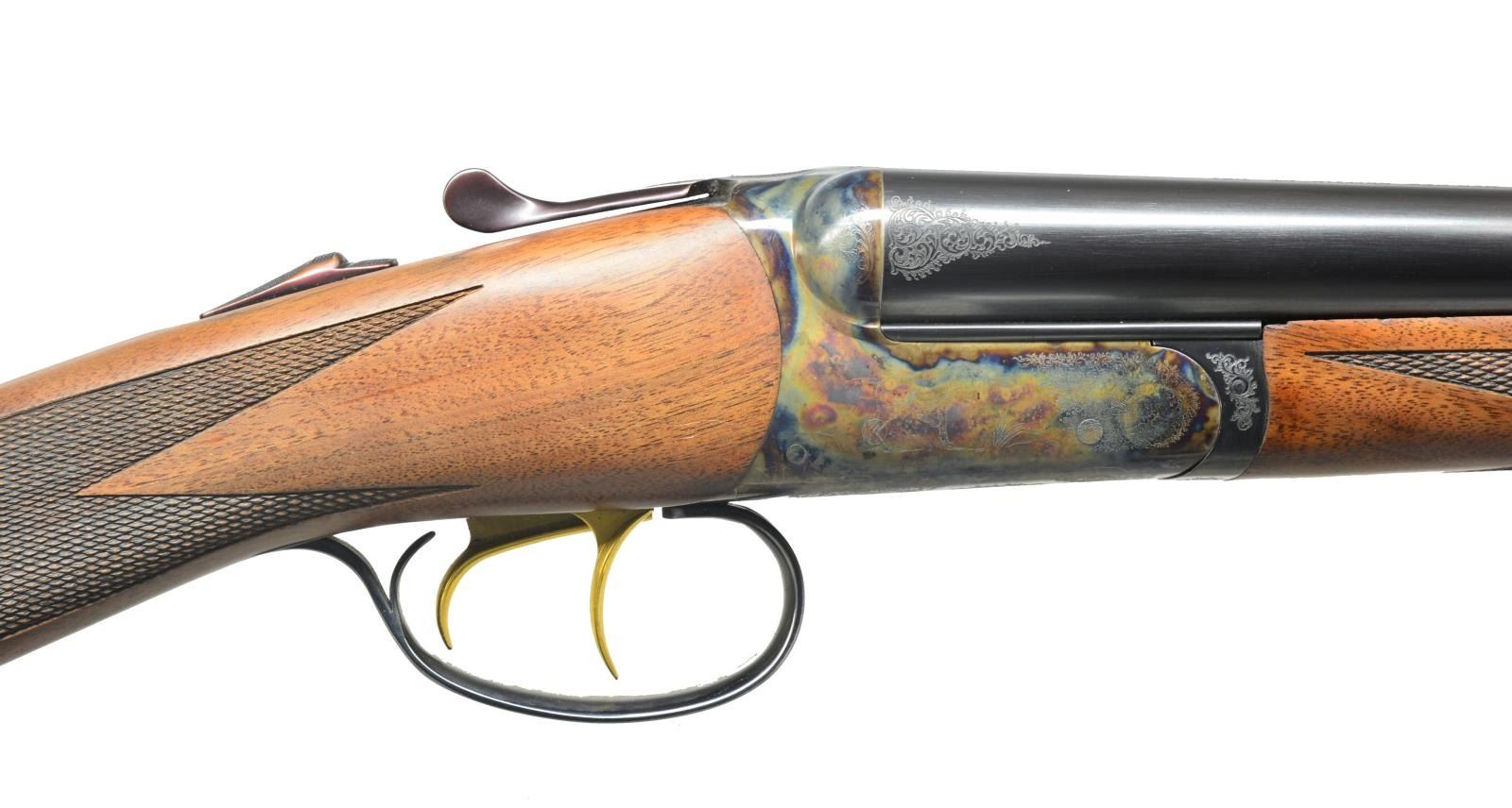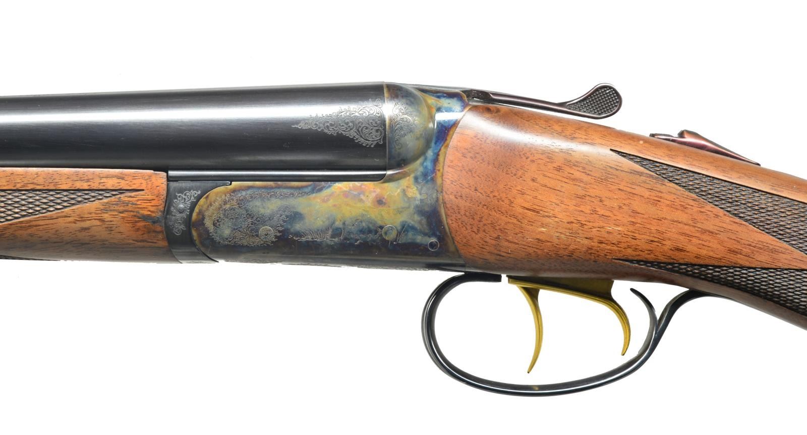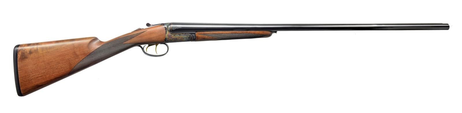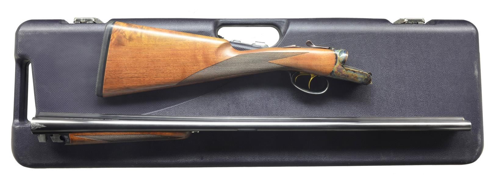 ACTION W/ CASE. Cal. 16 Ga. S# RBL003855. Bbls. 29" w/ fixed chokes marked for IC & MOD are fitted w/ swamped game rib. Maker's name & address, model & ga. are on tops. Case hardened RBL boxlock type action features automatic safety & gold plated dbl. triggers. Action is "engraved" w/ 50% coverage sm. scroll & dogs on sides w/ setter on left & pointer on right. Lightly figured American walnut straight grip buttstock measures 14 3/8" over black Galazan pad. Grip is laser checkered, matching splinter ejector forend has Anson type release. MEASUREMENTS: DAC: 1 9/16". DAH: 2 1/2" Cast: Neutral. WEIGHT: 5 lbs. 13 oz. UNATTACHED ACCESSORIES: gun comes in dark blue ABS carrying case containing a pair of snapcaps & extra interchangable longer pad. CONDITION: excellent w/ evidence of limited field use w/ light handling marks on wood & metal. Mechanically fine. (20-1662/MGM72). MODERN. $1,500-2,500.