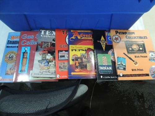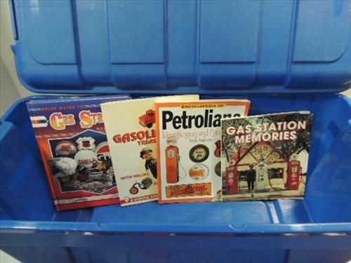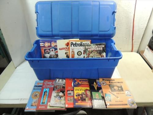 16 GALLON RUBBERMAID STORAGE BIN & 11 REFERENCE PRICE GUIDES FOR PETROLIANA COLLECTIBLES. AS SHOWN. VIEW PICTURE FOR DETAIL.