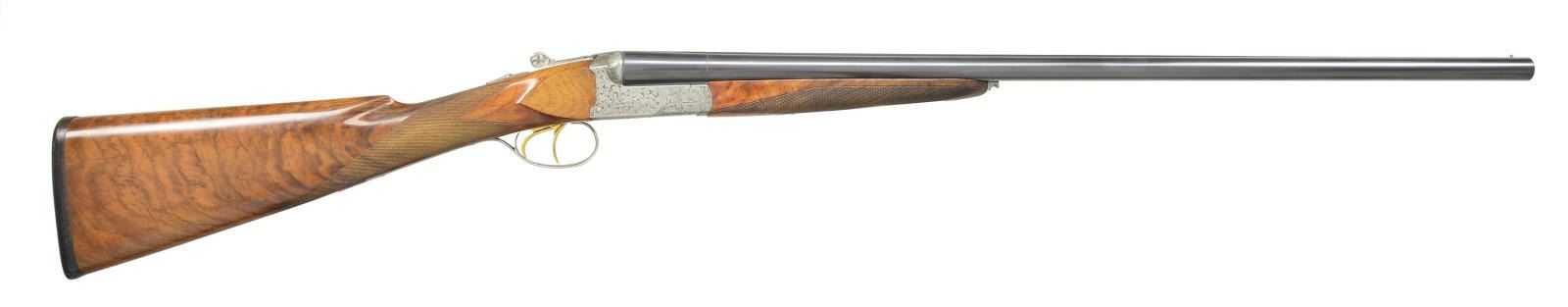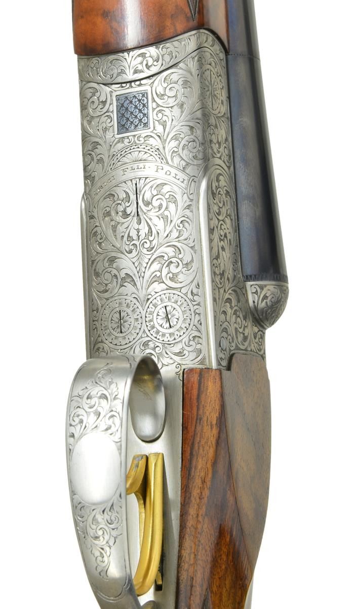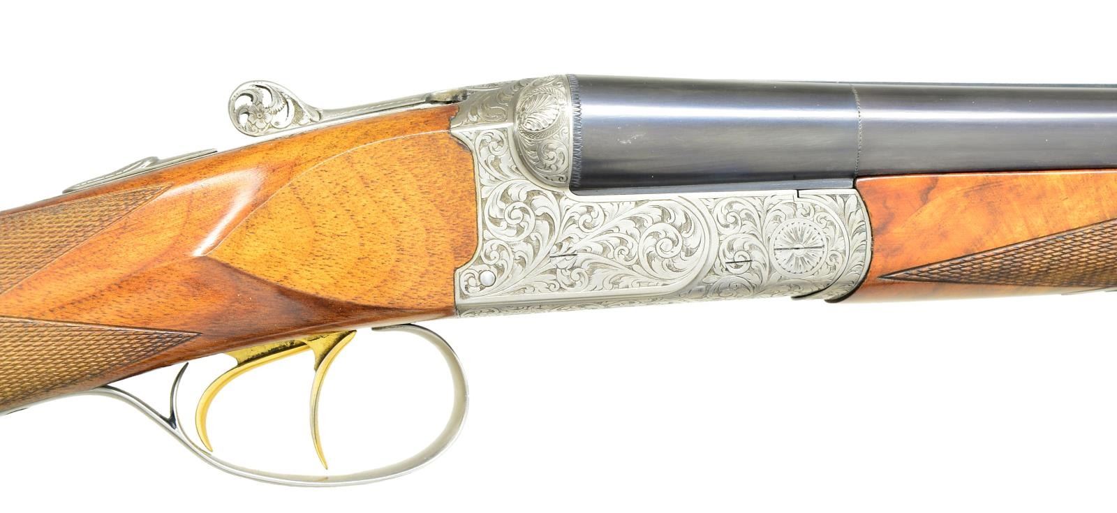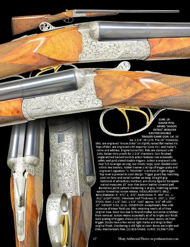 BOXLOCK EJECTOR DOUBLE TRIGGER GAME GUN. Cal. 16 Ga. 2 3/4". S# 1175. The 28" monobloc bbls. are engraved "Anson Extra" on slightly raised flat matted rib. Tops of bbls. are engraved with importer (Cole Inc.) and maker's name and address. Engine turned bbl. flats are stamped with 2001 Italian nitro proofs for 2 3/4" chambers. Coin finished, single arched backed boxlock action features non automatic safety and gold plated double triggers. Action is engraved with near full coverage varying, but mostly large, open shaded scroll within line borders. Maker's name is at top of trigger plate and engraver's signature "V. TEMPONI" is in front of right trigger. Top lever is pierced in scroll design. Trigger guard has matching scroll on bow and serial number on tang. Straight grip buttstock of attractively marbled, and stump figured European walnut measures 15" over thin brown leather covered pad. Borderless point pattern checkering is at grip. Matching splinter ejector forend has Anson release. MEASUREMENTS: BBLS.: Bore Diameter: R: .671", L: .672". Restrictions: R: .004" (IC) , L: .011" (LIGHT MOD). Minimum Wall Thickness: R: .030", L: .030". STOCK: DAH: 2 1/8". DAC: 1 3/8". CAST: approx. 5/8" off. LOP: 15". WEIGHT: 5 lbs. 13 oz. CONDITION: exceptionally fine with evidence of minor field use. Bbls. retaining nearly all of their original blue. Most loss due to forend chatter and some scratches from removal. Action retains essentially all of its bright coin finish. Gold plating of triggers shows only hint of wear, mostly on front trigger. Stocks have a few minor light marks and dings in their original finish. Checkering is still light in color. Bores are bright and shiny. Mechanically fine. (22-923/MGM). CURIO. $5,500-7,000.