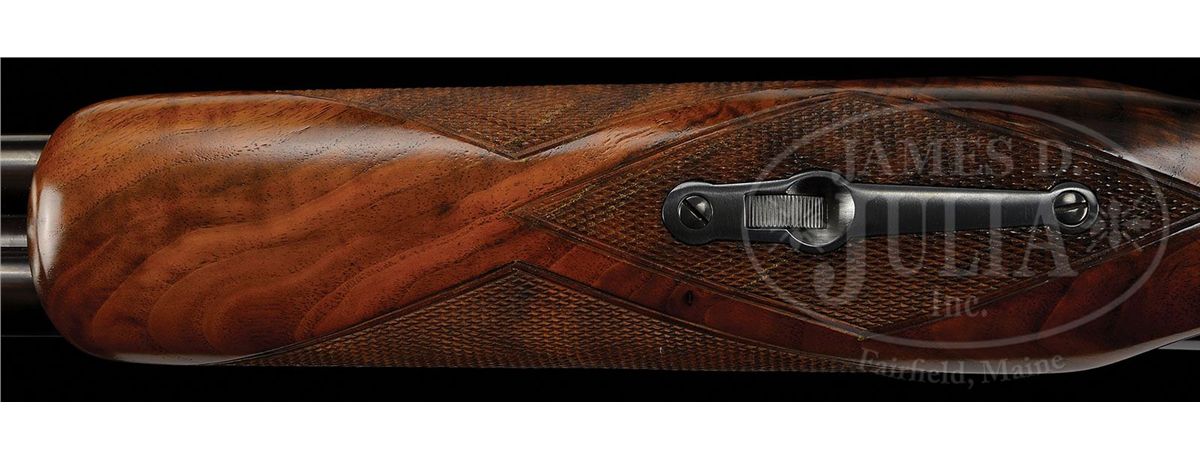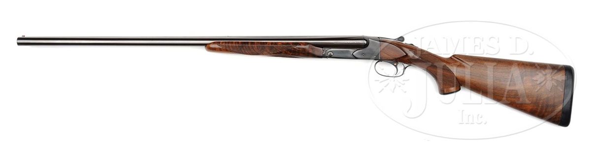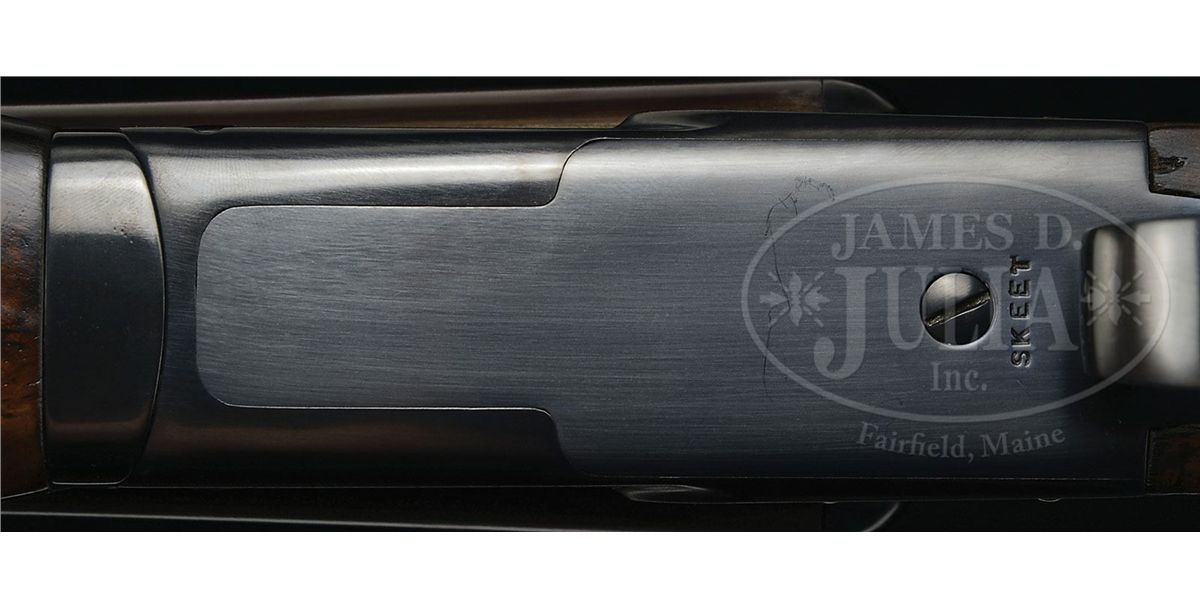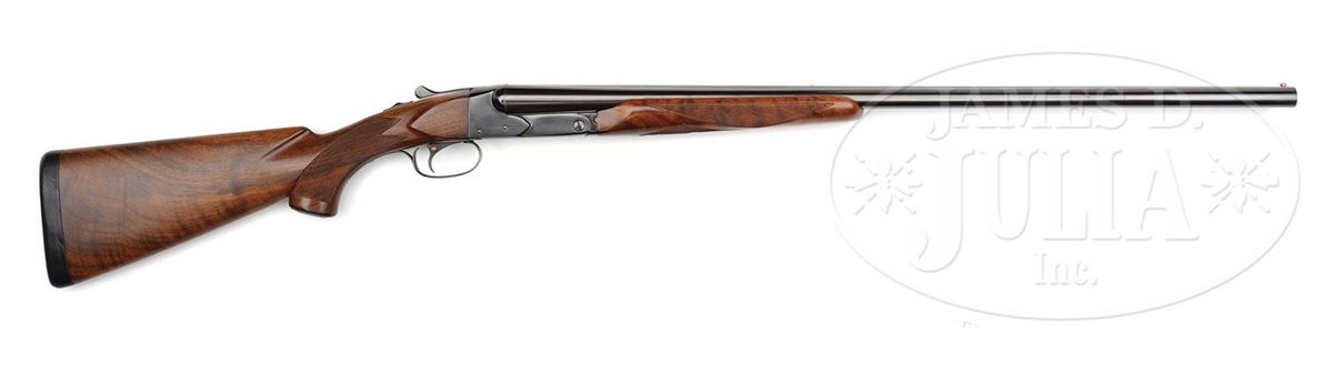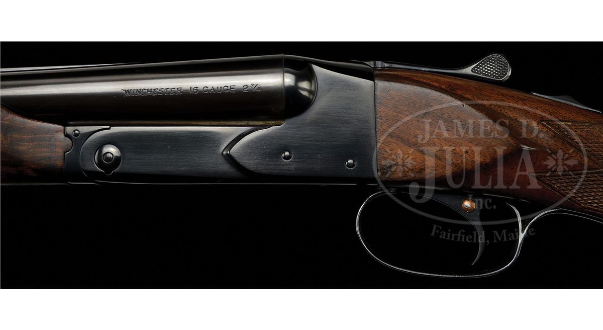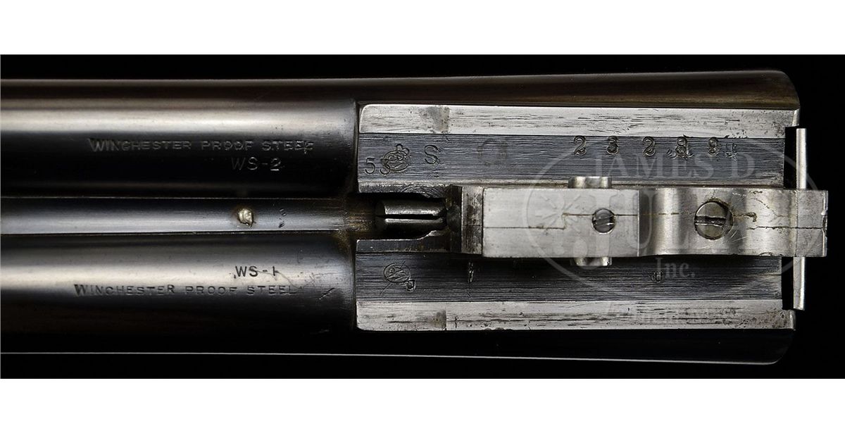 SN 23289. Cal. 16 ga. 2-5/8" Chambers. 28" Bbls with concave, matted rib are marked "WINCHESTER - 16 GAUGE 2-3/4" on side of left bbl. Bbl flats are stamped with SN, "S", and Winchester proofs, along with proof steel markings. Bottoms of bbls are stamped "WS-1" and "WS-2". Standard blued action features non-automatic safety and blued single selective trigger. "Skeet" is stamped on trigger plate in front of trigger guard. Well figured American walnut Winchester capped pistol grip buttstock measures 14-1/4" over black leather covered pad. Matching beavertail ejector forend has reinforcing brace. Bore diameter: left-.623, right -.623. Bore restrictions: left -.020, right -.004. Wall thickness: left -.021, right -.023. Drop at heel: 2-1/2", drop at comb: 1-1/2". Weight: 6 lbs. 14 oz. LOP: 14-1/4". PROVENANCE: From the collection of J. E. Fender, including his notes regarding this gun. CONDITION: Excellent, as refinished. Metal parts retain essentially all of a good quality re-blue, with only a few minor subsequent marks. Stocks retain nearly all of a satin finish, checkering re-cut. Bores are excellent. Action is tight. Bbls are on face. Ejectors are in time. Trigger works. Forend is slightly loose. 4-48897 MGM184