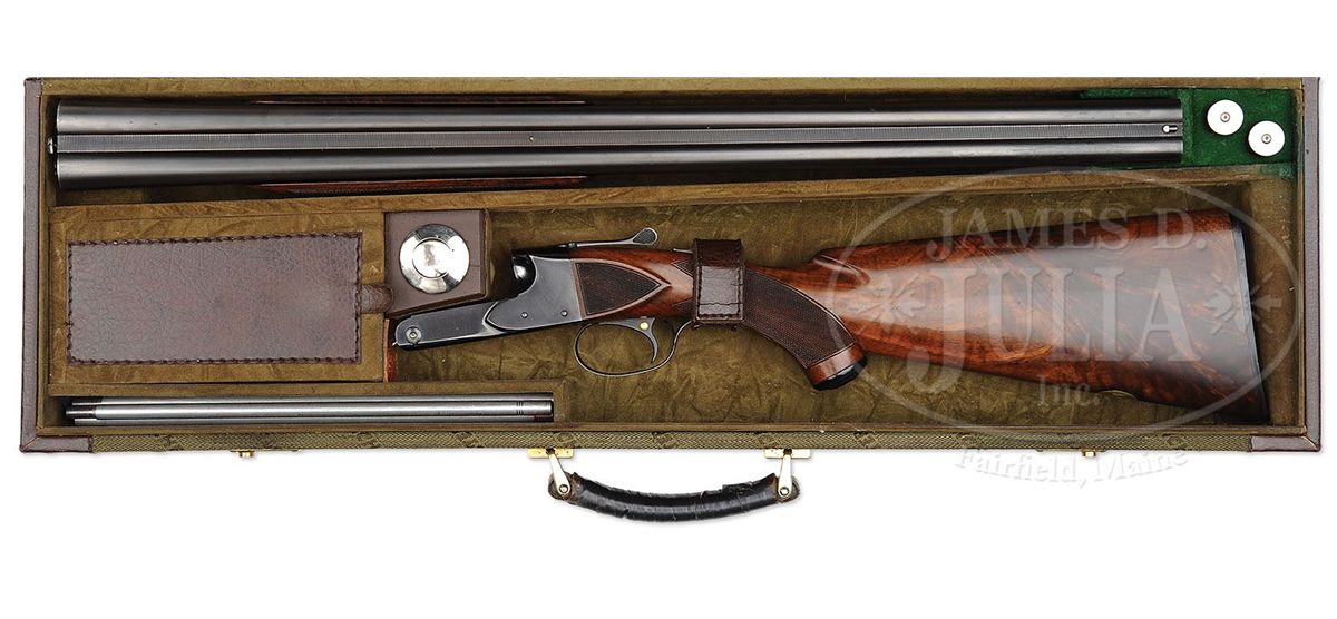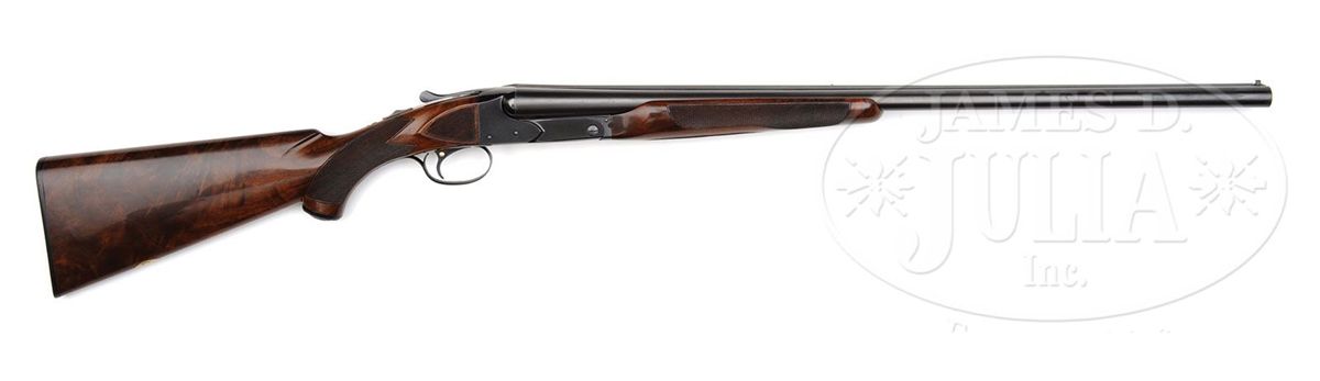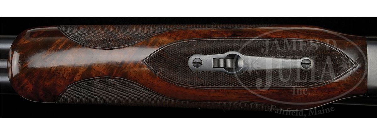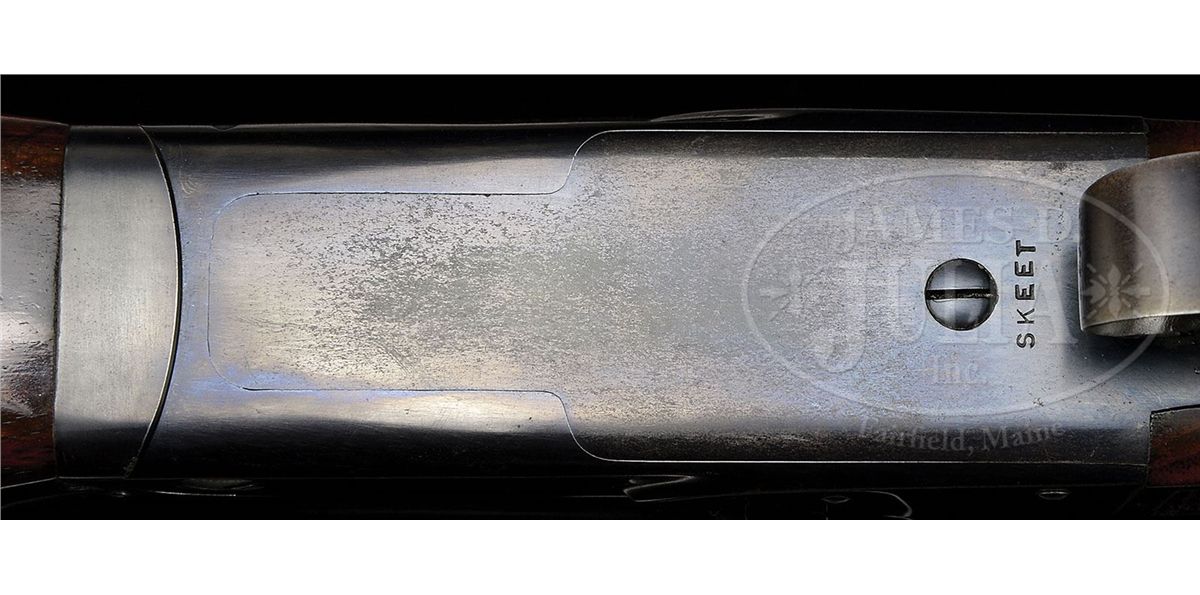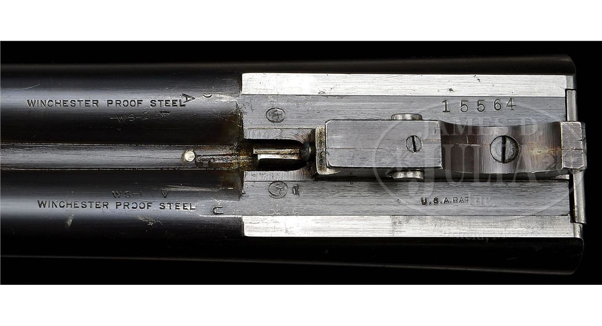 SN 15564. Cal. 16 ga. 2-3/4" Chambers. 26" Bbls with concave, matted rib fitted with silver mid and white Bradley front beads, are marked "WINCHESTER - 16 GAUGE" and "2-3/4 CHAM." on left rear. All correct stamps are on bbl flats and bottoms of bbls, and with chokes "WS-1" and "WS-2". Standard blued action with patent and Winchester nomenclature on water table features automatic safety and blued single selective trigger. Floorplate is stamped "Skeet" under screw. XXX flame figured American walnut capped pistol grip buttstock measures 14" over Winchester composition buttplate. Skeet grade checkering is at grip and side panels. There is a gold oval on toe line engraved "CFM". Matching beavertail ejector forend does not have reinforcing brace. Bore diameter: left-.667, right -.667. Bore restrictions: left -.007, right -.005. Wall thickness: left -.030, right -.027. Drop at heel: 2-1/2", drop at comb: 1-1/2". Weight: 7 lbs. 1 oz. LOP: 14". Green canvas Winchester case with leather trim is lined in patterned green cloth with black leather gold embossed Model 21 label on lid. Case contains aluminum cleaning rod with brush and mop, a round oil bottle, and a pair of Winchester snap caps. CONDITION: Excellent. Bbls retain 90-95% orig blue with some cleaned and re-darkened oxidation, thinning at breech. Action retains approx 90% orig blue, most loss on floorplate which is considerably flaked and slightly brown. Stocks retain over 90% of their orig finish with a number of minor nicks and light marks, some areas thinning. Bores are excellent. Action is tight. Ejectors are slightly out of time, but strong. Trigger works. Case is very good, with some slight soiling. Interior and accessories are fine. 4-48715 MGM188