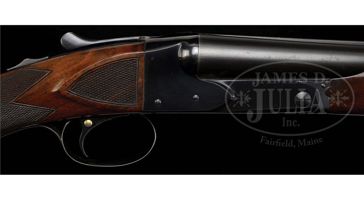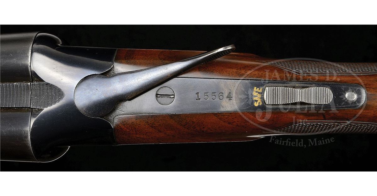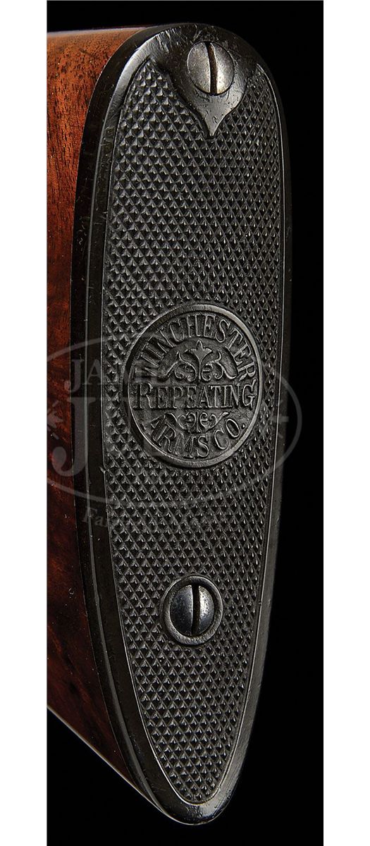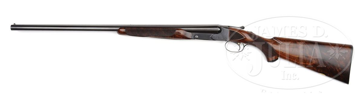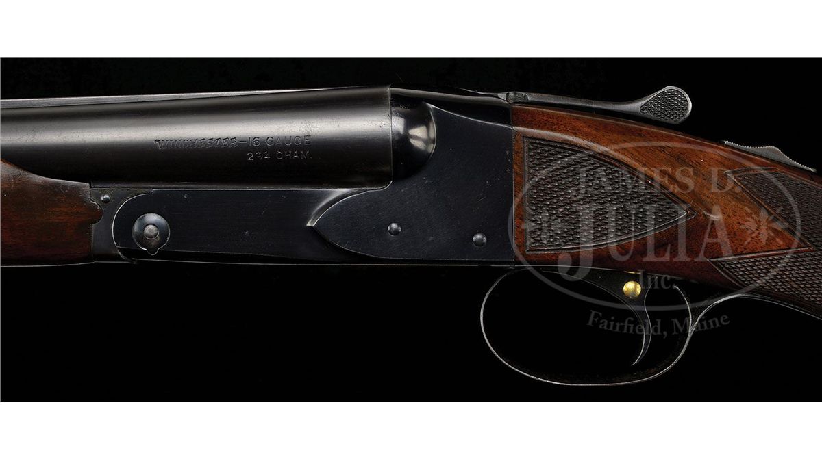 SN 15564. Cal. 16 ga. 2-3/4" Chambers. 26" Bbls with concave, matted rib fitted with silver mid and white Bradley front beads, are marked "WINCHESTER - 16 GAUGE" and "2-3/4 CHAM." on left rear. All correct stamps are on bbl flats and bottoms of bbls, and with chokes "WS-1" and "WS-2". Standard blued action with patent and Winchester nomenclature on water table features automatic safety and blued single selective trigger. Floorplate is stamped "Skeet" under screw. XXX flame figured American walnut capped pistol grip buttstock measures 14" over Winchester composition buttplate. Skeet grade checkering is at grip and side panels. There is a gold oval on toe line engraved "CFM". Matching beavertail ejector forend does not have reinforcing brace. Bore diameter: left-.667, right -.667. Bore restrictions: left -.007, right -.005. Wall thickness: left -.030, right -.027. Drop at heel: 2-1/2", drop at comb: 1-1/2". Weight: 7 lbs. 1 oz. LOP: 14". Green canvas Winchester case with leather trim is lined in patterned green cloth with black leather gold embossed Model 21 label on lid. Case contains aluminum cleaning rod with brush and mop, a round oil bottle, and a pair of Winchester snap caps. CONDITION: Excellent. Bbls retain 90-95% orig blue with some cleaned and re-darkened oxidation, thinning at breech. Action retains approx 90% orig blue, most loss on floorplate which is considerably flaked and slightly brown. Stocks retain over 90% of their orig finish with a number of minor nicks and light marks, some areas thinning. Bores are excellent. Action is tight. Ejectors are slightly out of time, but strong. Trigger works. Case is very good, with some slight soiling. Interior and accessories are fine. 4-48715 MGM188