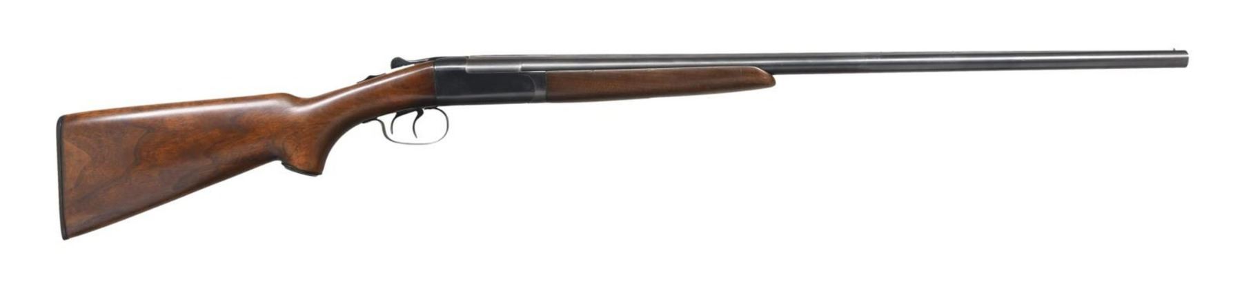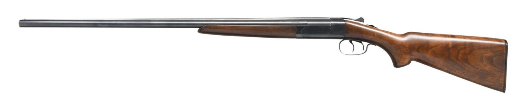 Cal. 16 Ga. 2-3/4". S# 23462. These rugged guns were made between 1940 and 1957 with a total production of about 116,000. These early gun has 28" barrels marked for mod and full chokes with Winchester markings on top left. Blued boxlock action with deep frame has automatic safety and double triggers. Capped pistol grip American walnut stock measures 14-1/2" over Winchester buttplate. Broad forend has spring tension release. MEASUREMENTS: STOCK: DAH: 2-3/16". DAC: 1-3/8". CAST: neutral. LOP: 14-1/2". WEIGHT: 6 lb. 11 oz. CONDITION: very fine retaining about 90% original blue. Stock with nearly all its original finish. Bores are bright and shiny. Mechanically good. (23-5986/MGM). CURIO. $500-1,000.