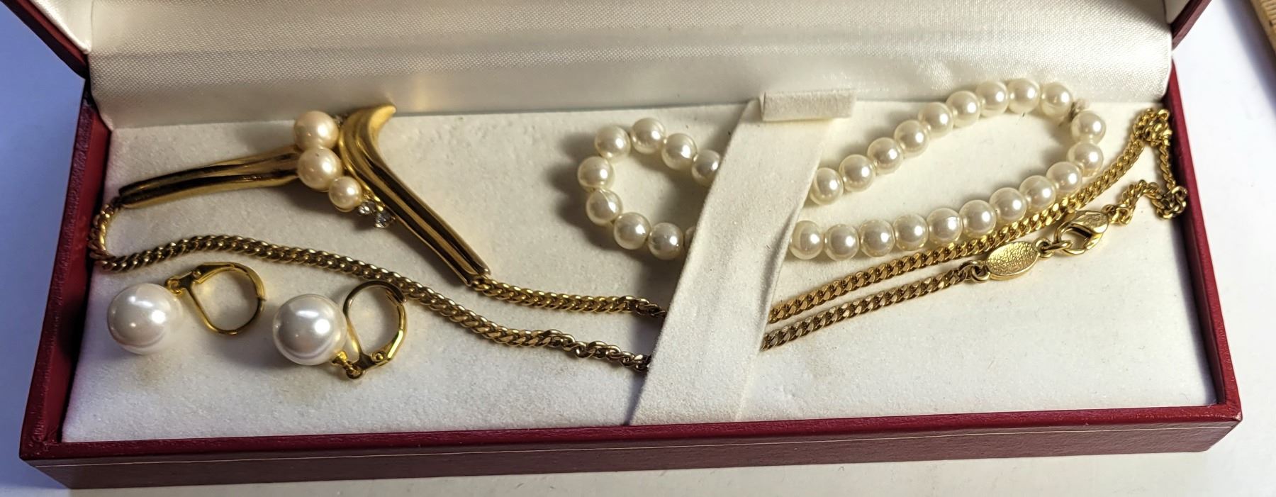 16) GOLD TONE AND WHITE PEARL DROP EARRINGS,