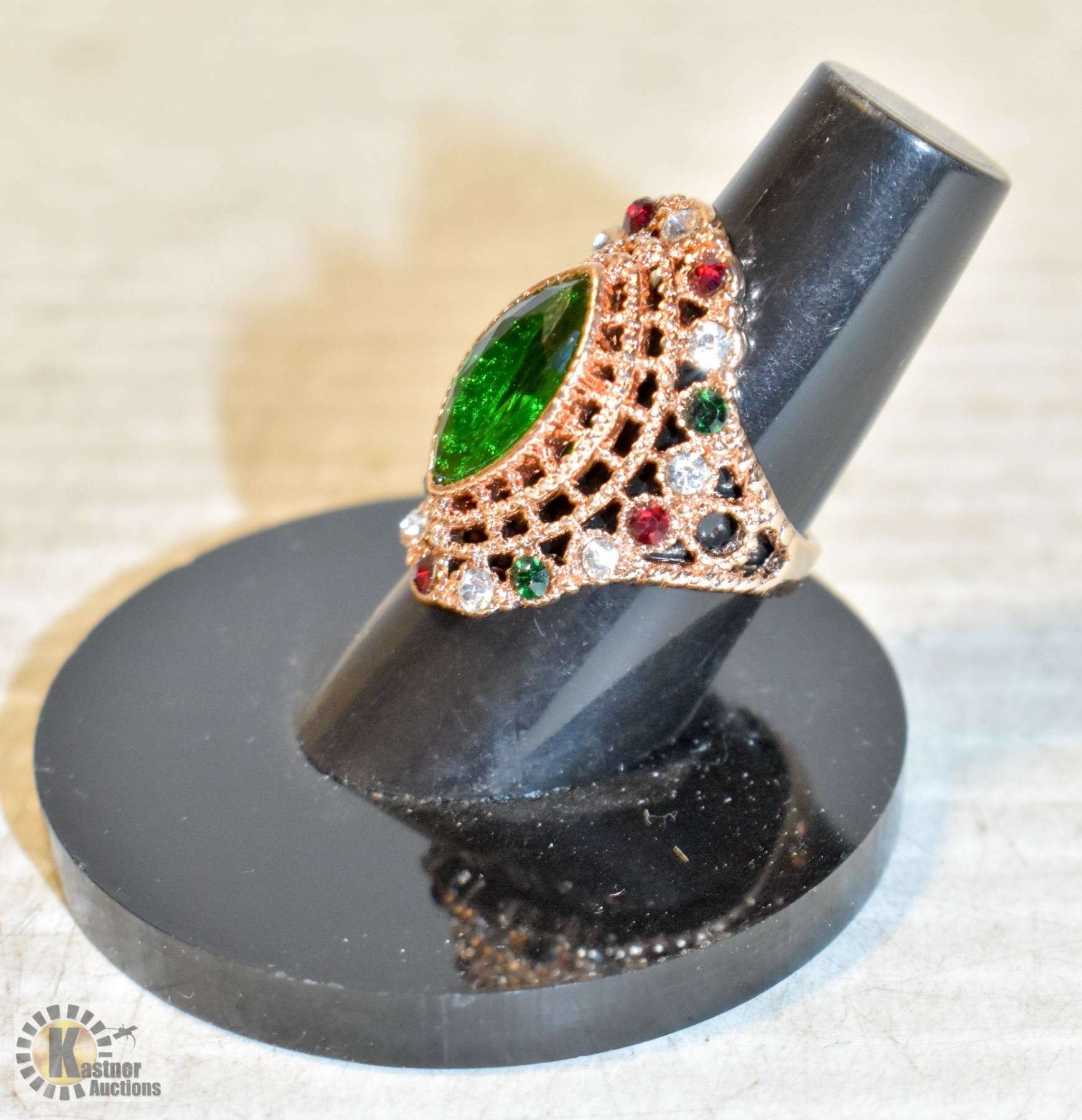 CLEAR, RED AND GREEN CZ CRYSTALS, LARGE EMERALD CUT GREEN CZ CENTRE STONE, SIZE 6.5. JEWELLERY