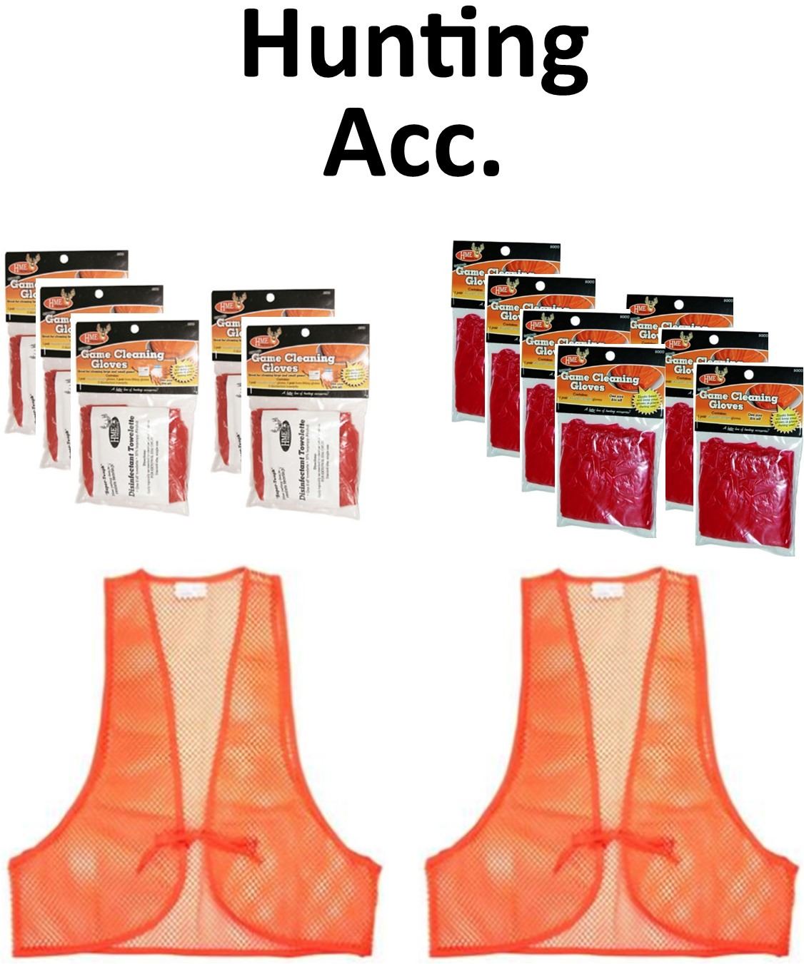 16 Hunting Accessories, Mesh Hunting Vest - Blaze Orange(2), Game Cleaning Gloves w/towelette(7), Single Game Cleaning Glove(7)