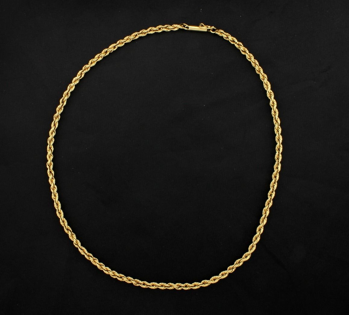 This chain is 14K yellow gold and 3.4mm thick, it has a safety clasp as well. 6.0g