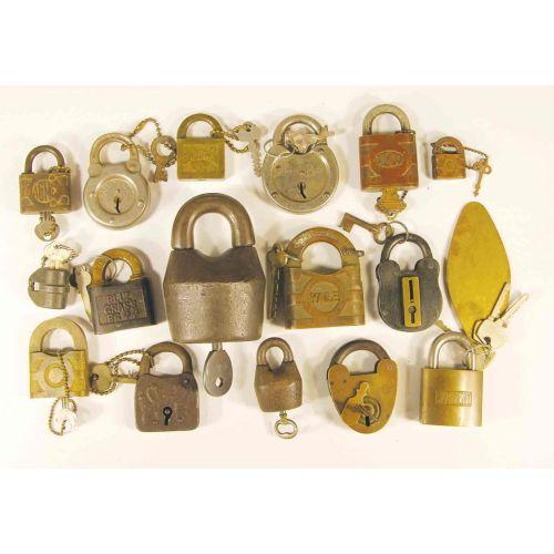 16 Misc. Padlocks including a large barrel. Various sizes and condition, all with keys.