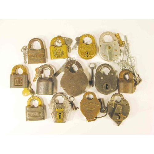 16 Misc. Padlocks including a Simmons, Yale, Western Union Telegraph Co. and V-R. Various sizes and conditions, all with keys.