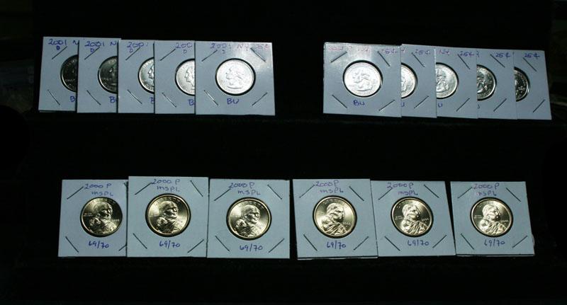 15 Modern coins in 2x2 holders all in Gem+ Condition, 6 2000-p Golden Dollars, one with Awesome reverse toning and 5 2001-p NY State Quarters and 5 2001-d NY Quarters. Coin World's Coin Values lists the NY Quarters in ms65 at $6 each and the 2000 Dollars in Gem at $9.00 each. Estimated Value $111