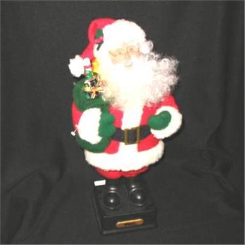 16" Battery Operated Santa doll, arms and head move, posable arms, This a Christmas display figure, plays 18 Christmas tunes, on/off switch. Uses 2 C size batteries(not included). The doll is in excelent condition, the original box is in good condition.