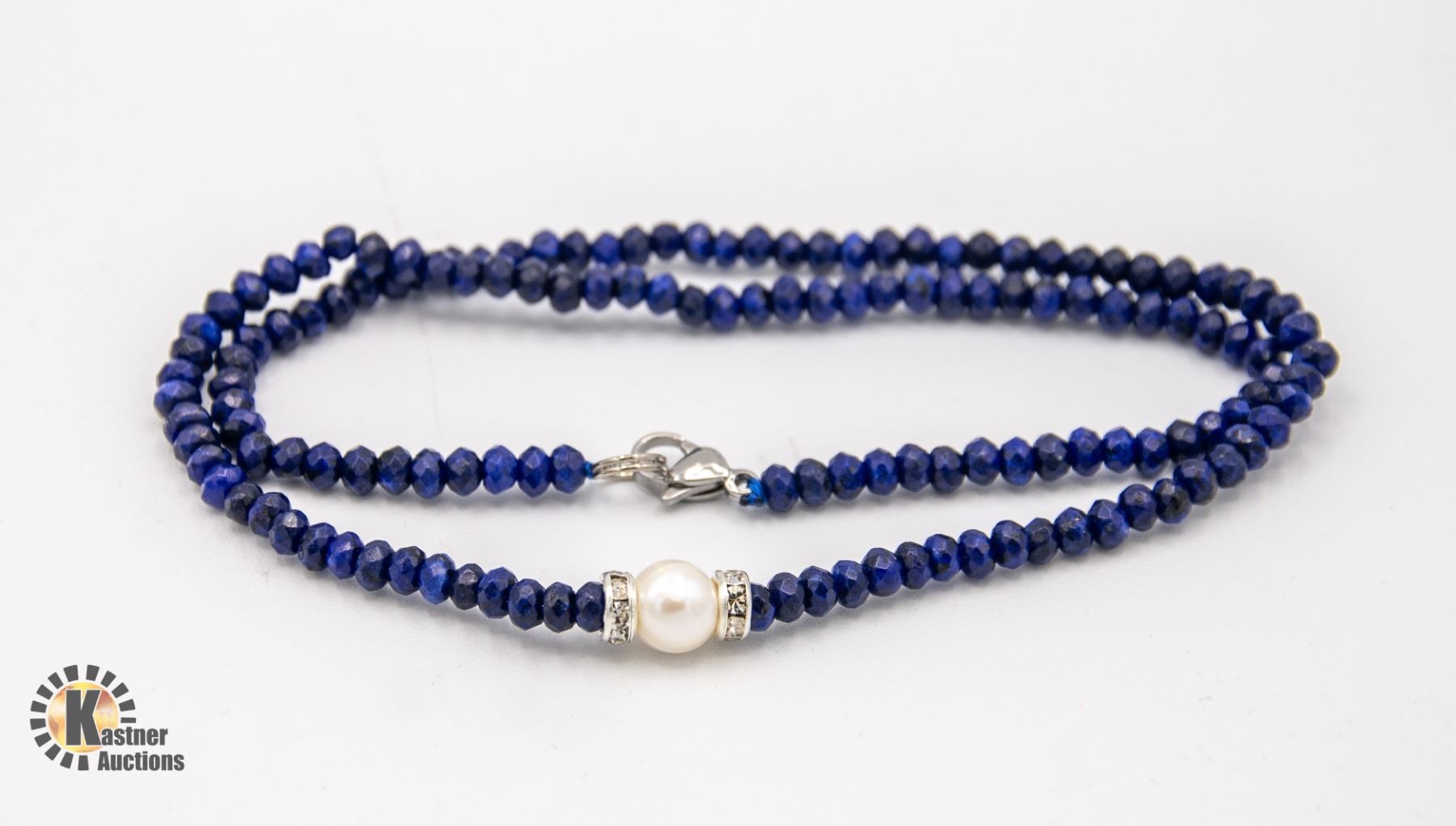 #16- NATURAL DARK BLUE JADE ,PEARL NECKLACE 18"