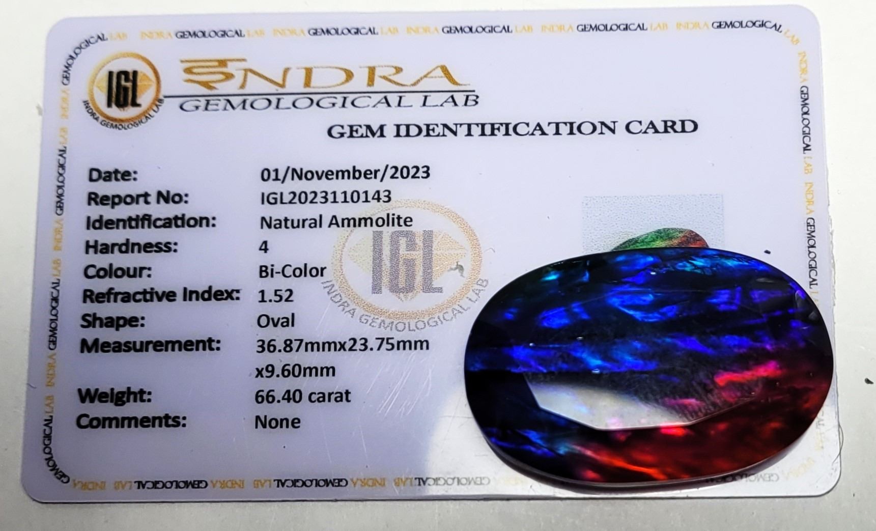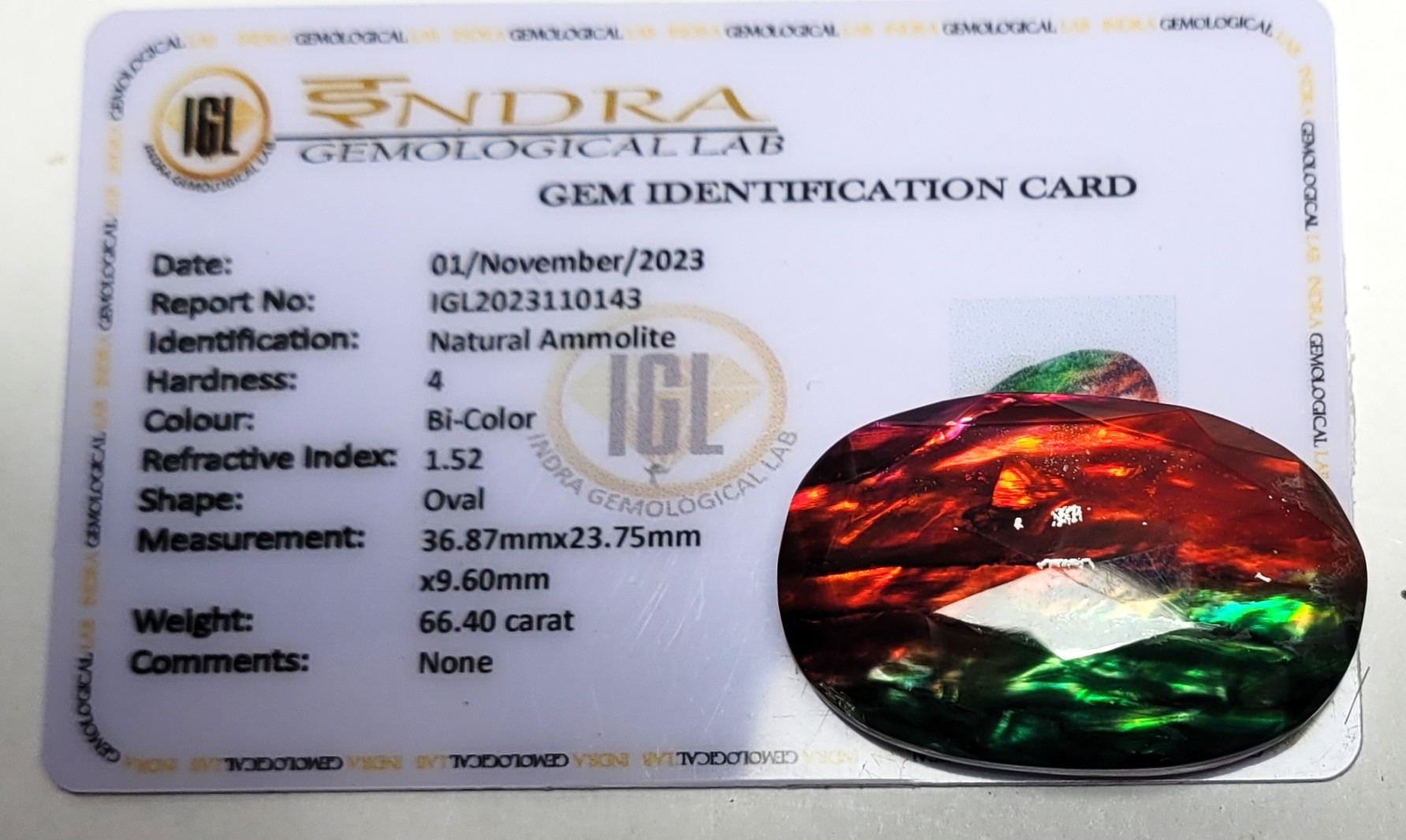 SPECIMEN, 66.4 CT & INFO CARD, READY FOR SETTING. JEWELLERY