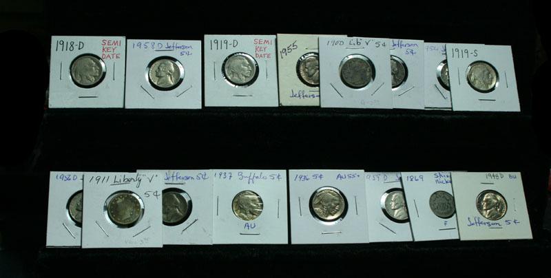 Included are the following : 1869 Shield Nickel; 1900 & 1911 V Nicks; 1918-d, 1919-d, 1919-s, 1936-p, 1937-p Buffalos; 1943-p Silver War Nick; 1948-d, 1954-p, 1954-d, 1955-p, 1956-d, 1958-d, 1959-d Jeffersons Estimated Value $100