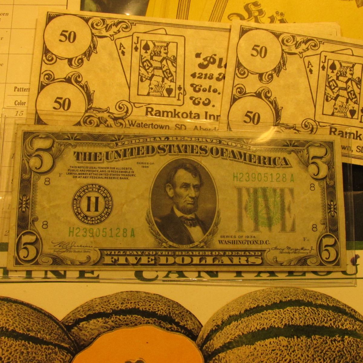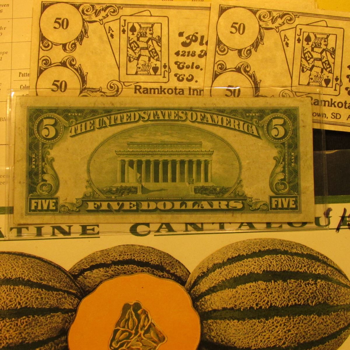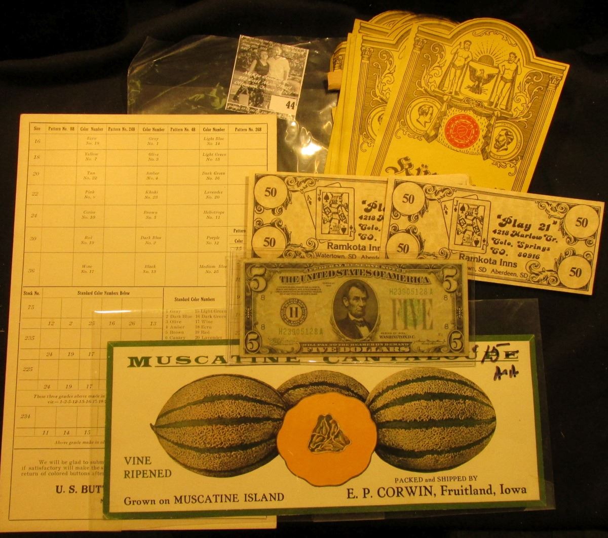 (16) Old German Liquor Bottle labels (some corner damage); "Muscatine Cantaloupe…Grown on Muscatine Island…" Crate label; (15) pieces of Ramkota Inns Scrip; poster "U.S. Button Export Company Muscatine, Iowa, U.S.A." Poster; & Series 1934 Five Dollar Federal Reserve Note St. Louis, Mo. plate numbers F37/1389 in EF condition.