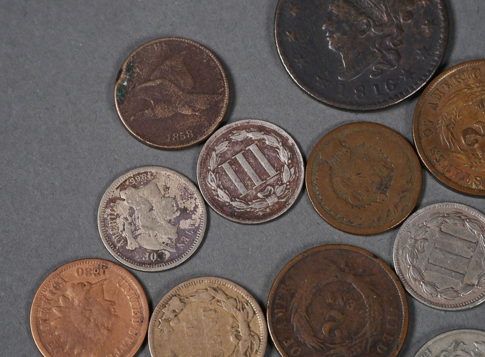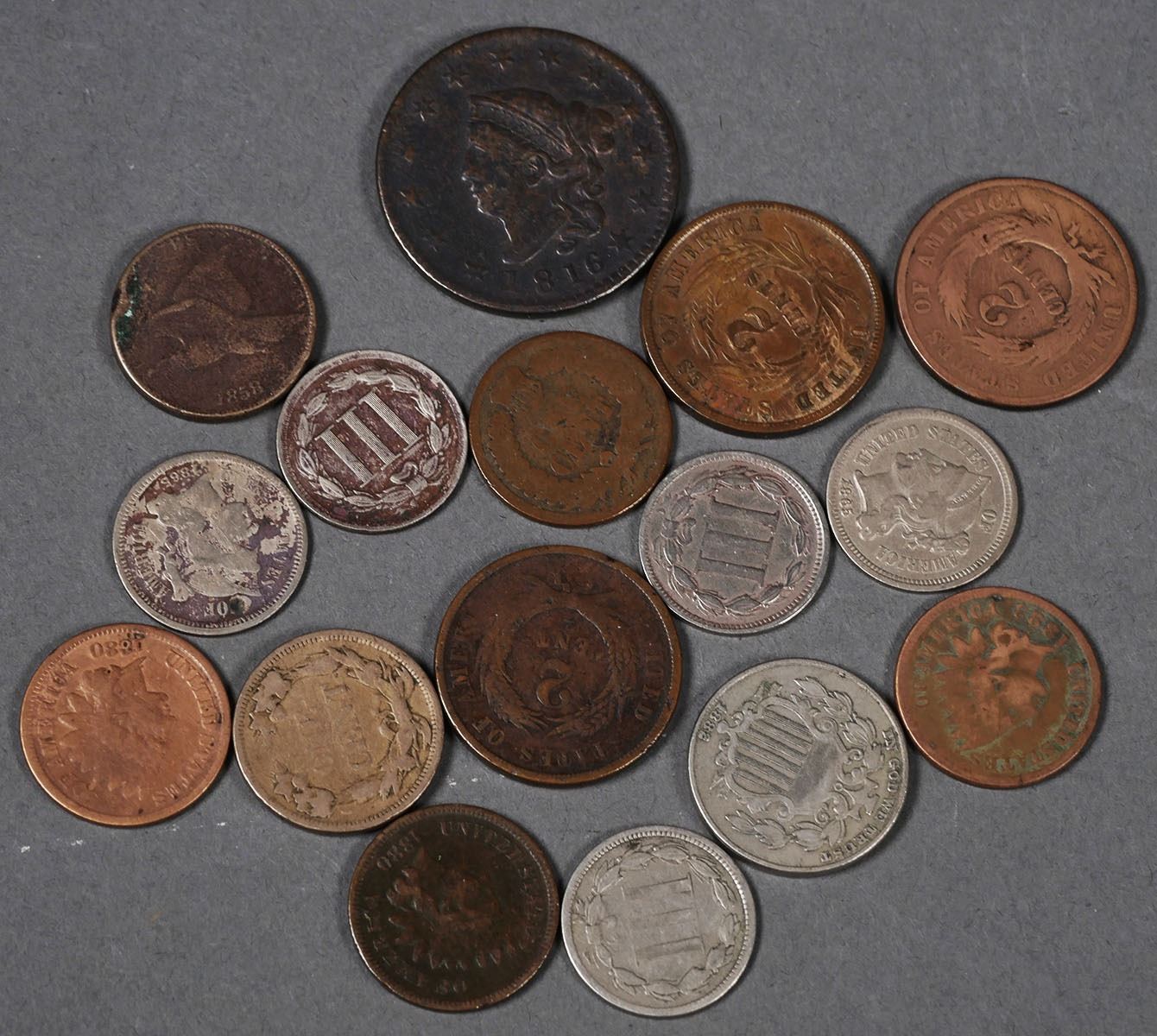 (1) 1816 Coronet Liberty Head Large Cent. (4) Indian Head Pennies, (2) 1880, 1865 & 1883. (3) Two Cent, 1865, 1864 & 1867. (5) Three Cent (3) 1865, (2) 1866. (2) Flying Eagle Pennies (2) 1858. (1) 1882 Shield 5 Cents. All 1c, 2c, 3c & 5c coins are in circulated condition. See photos for more condition details.