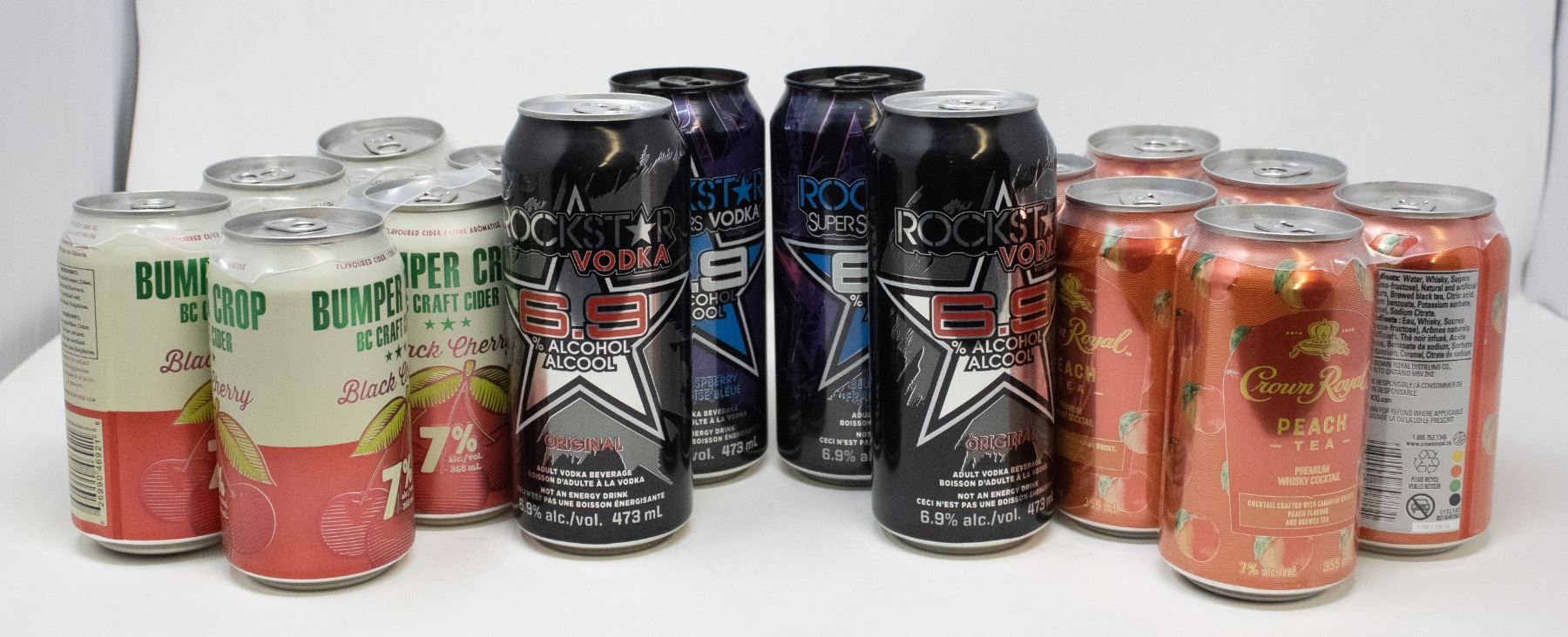 4 X ROCKSTAR VODKA 473ML 6.9% ALC - 6 X CROWN ROYAL PEACH TEA 355ML 7% ALC - 6 X BUMBER CROP BLACK CHERRY CIDER 355ML 7% ALC