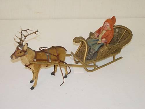 16" PAINTED WOODEN SLEIGH W/ PAPIER MACHE SANTA & SINGLE REINDEER-REINDEER IS FELT COVERED & HEAD COMES OFF FOR CANDY CONTAINER - LOSSES & IMPERFECTIONS;