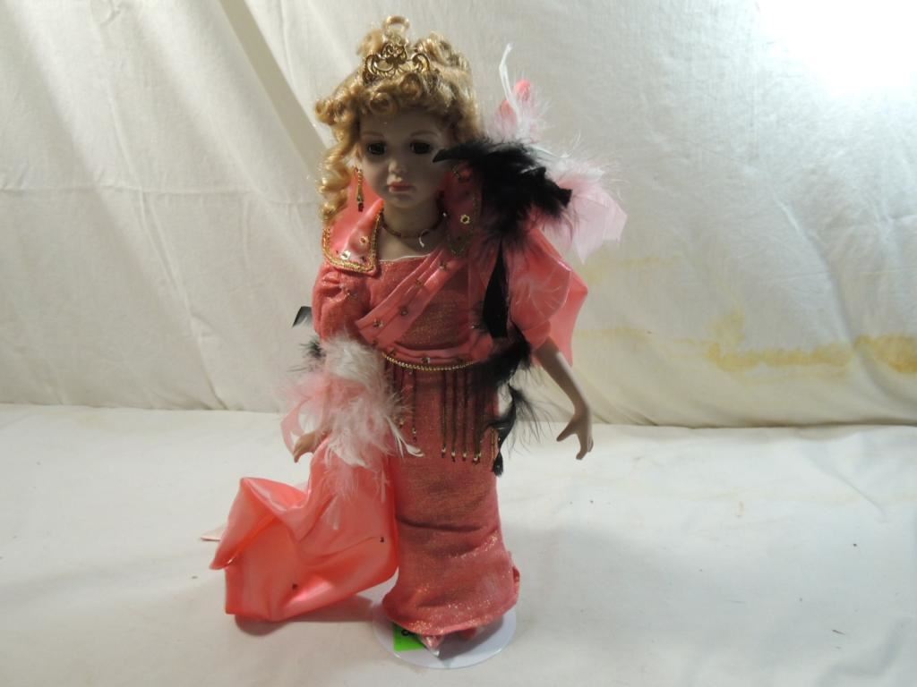 TITANIC ERA PINK DRESS FEATHERS BEADS BLONDE HAIR UP DO, BROWN EYES PORCELAIN DOLL, 16" TALL ON STAND BEAUTIFUL GOOD CONDITION COLLECTIBLE FROM PRIVATE DOLL COLLECTION. AS SHOWN SEE PHOTO FOR MORE DETAILS.