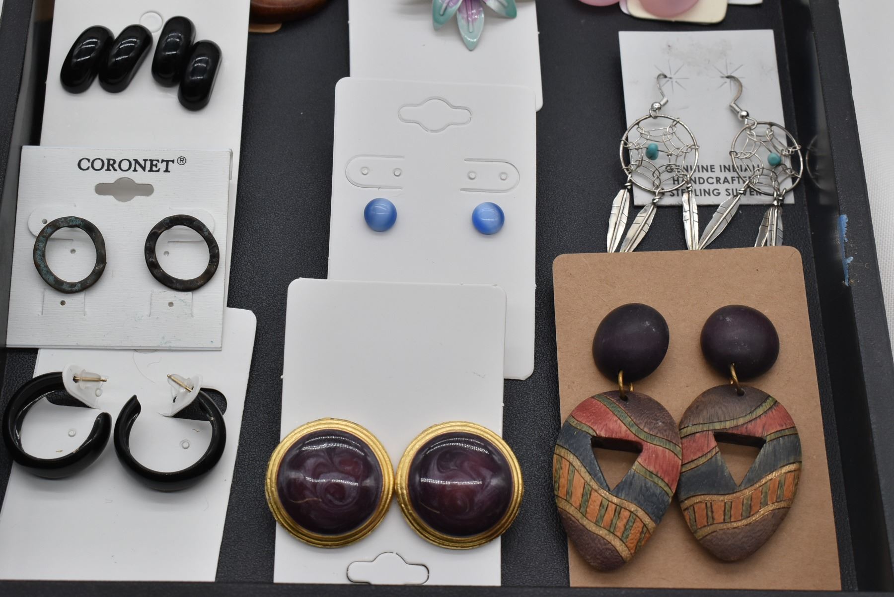 16 Pairs of Pierced Earrings, longest pair measures 3''L, includes wood, Native American Navajo Dream Catcher Earrings, metal, hoops, button, and many more