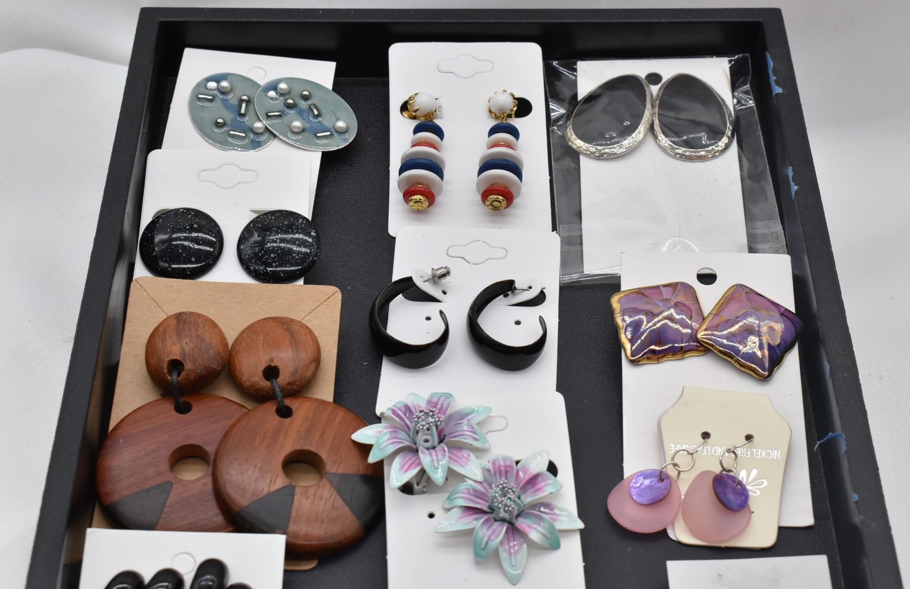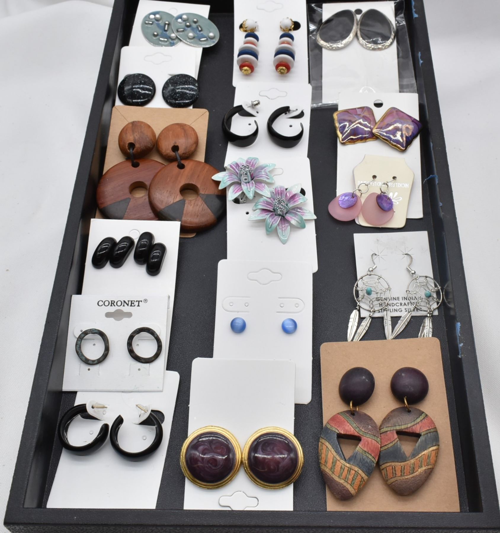 16 Pairs of Pierced Earrings, longest pair measures 3''L, includes wood, Native American Navajo Dream Catcher Earrings, metal, hoops, button, and many more