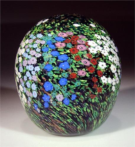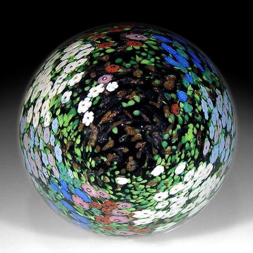 Peter Raos 1994 "Monet - Spring" clear-encased paperweight, with multi-colored millefiori flowers and green leaves on dark blue ground. Signed/dated. Diameter 2 7/8". NO RESERVE