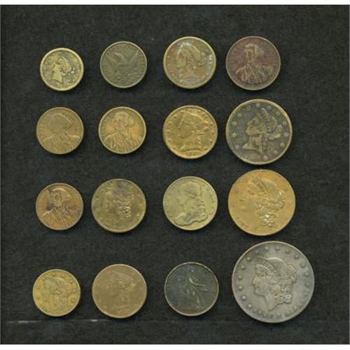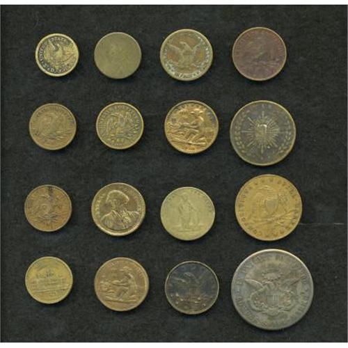 <B>16-Piece Gaming Counter Group.</B></I> Gaming counters, 16 miscellaneous pieces from the 19th century. The lot includes several different pieces with Liberty Head, George Washington, and many others. <BR><BR><b>Shipping:</b> Coins & Currency (<a target="_blank" href="http://www.heritageauctions.com/common/shipping.php">view shipping information</a>)