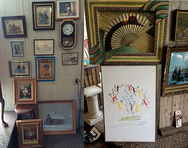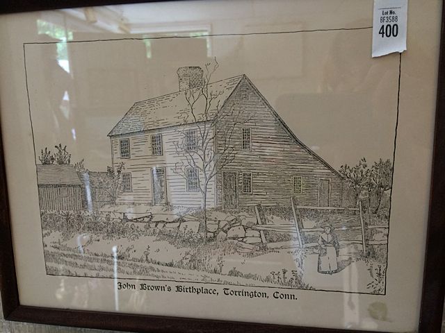 Shadow Box with Fan, Therum appears to be on cloth or linen with butterfly and Raspberries (he had it marked $290 retail in shop). Egytian art appears to be on fabric, flowers are on Board, Godey Girl Print, Quartz Regulator clock, USS Texas 4th Division picture of cannon guns on ship. Upton Morse 1979 painting looks to be of John Brown Home in Torrington, CT. Reverse painting on glass, village painting on board, and Picaso framed Print. These items may be picked up in Torrington, CT. Appointment time will be scheduled after auction date.