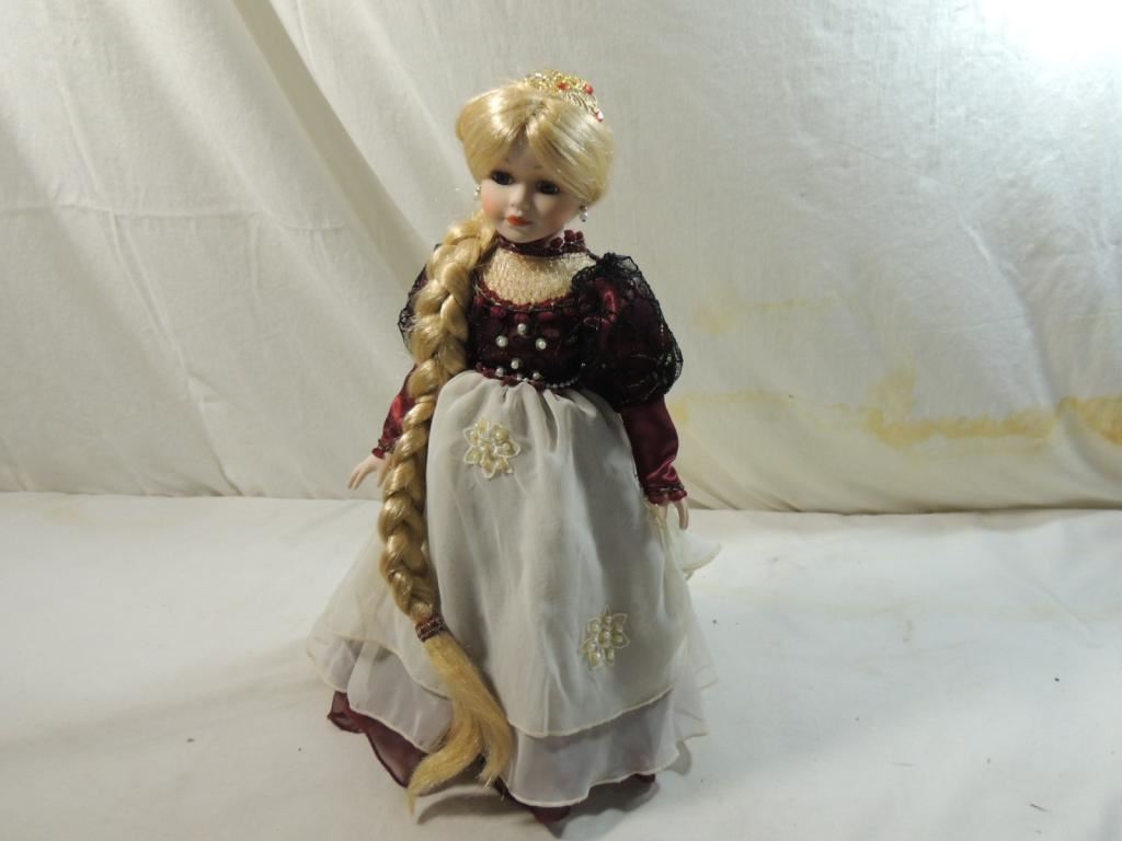 LONG BLONDE BRAID RENAISSANCE DRESS PORCELAIN DOLL, 16" TALL ON STAND BEAUTIFUL GOOD CONDITION COLLECTIBLE FROM PRIVATE DOLL COLLECTION. AS SHOWN SEE PHOTO FOR MORE DETAILS.