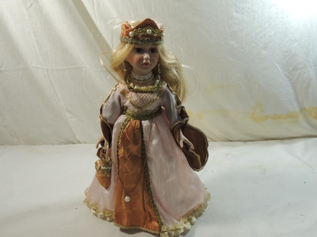 PINK AND BROWN LADY OF COURT DRESS LONG BLONDE HAIR BROWN EYES PORCELAIN DOLL, 16" TALL ON STAND BEAUTIFUL GOOD CONDITION COLLECTIBLE FROM PRIVATE DOLL COLLECTION. AS SHOWN SEE PHOTO FOR MORE DETAILS.