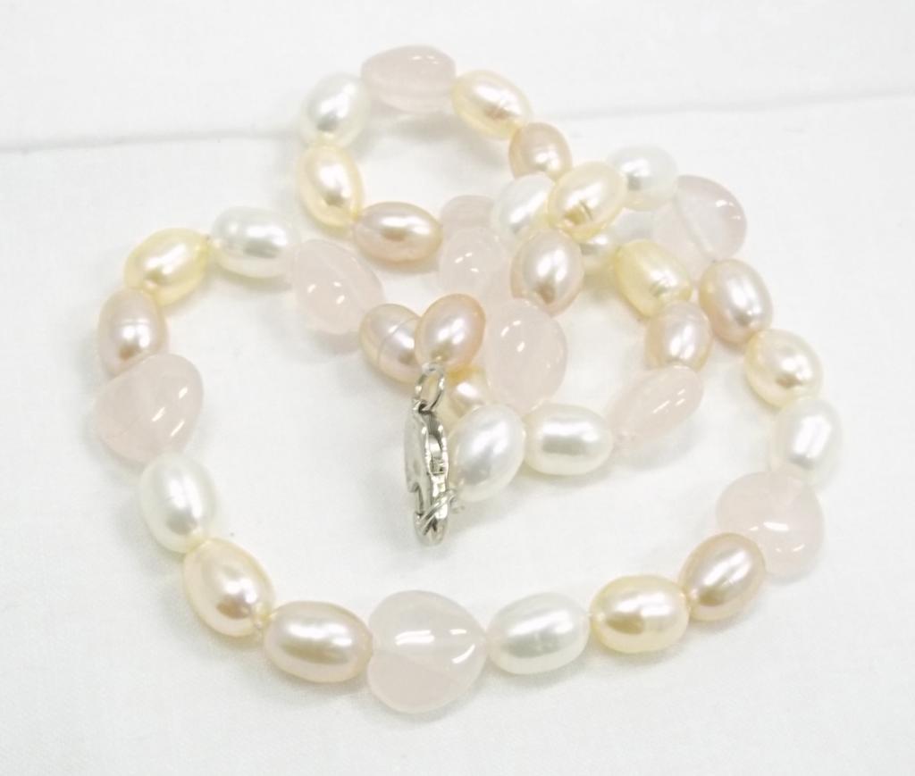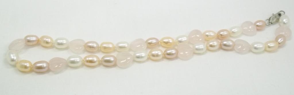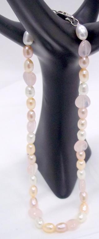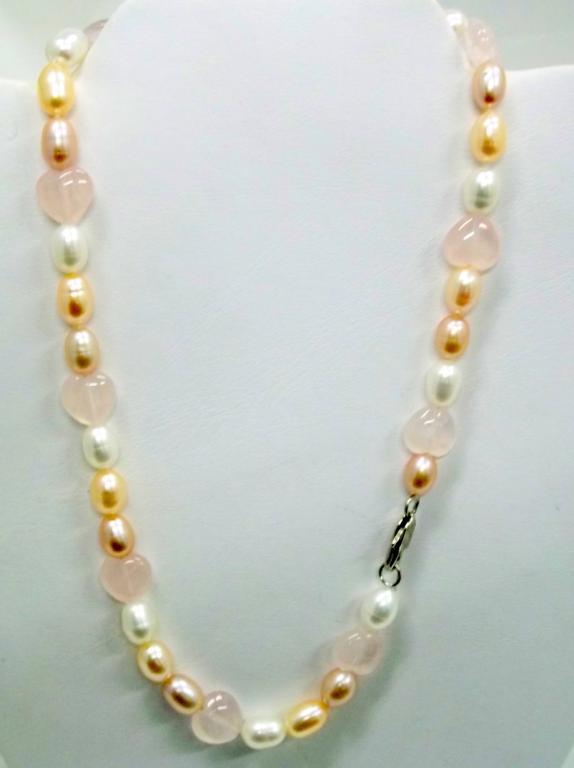 This beauty has a retail value of $880-. A one of a kind one strand 16" necklace with tri colored rice pearls and rose quartz.