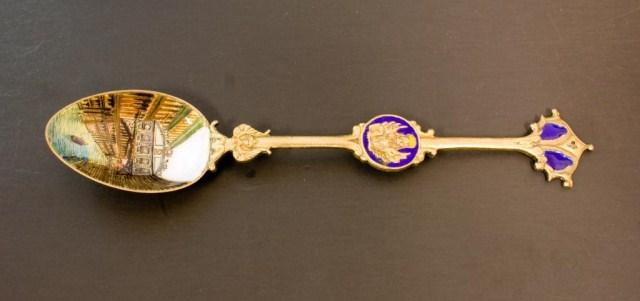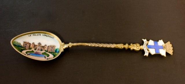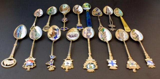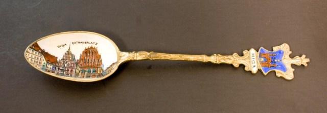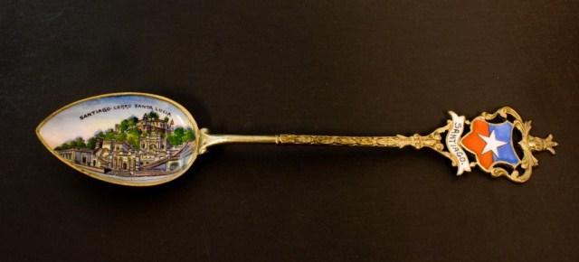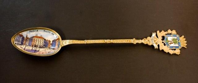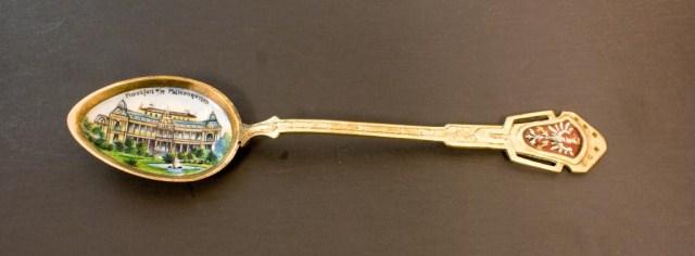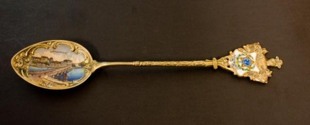 Havana, Cuba Gold Plated Spoon (not silver) Plique Du Jour Filigree Detroit Spoon (not silver) Sydney Australia Sterling St Georges Hall Liverpool English Sterling Frankfurt Palmengarten 800 Rathaus 800 Madrid, Puerta Del Sol 800 Badreichenhall 800 Santiago Cerro Santa Lucia 900 Venice Italy Gondolas scene 800 Chanomiz (?) lapis handle 800 Riga Rathausplatz 900 Le Palaislongchamp Sterling Pepnambuco Brazil 800 Grand Hotel Chowringhee Road Calcutta Sterling South American Style Man on Donkey 800 Each spoon measures about 5 1/4"