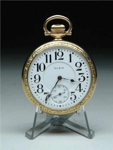 16 SIZE ELGIN POCKET WATCH. Veritas, 23 jewel. SN 16678516. Nicely engraved Railroad style case. Porcelain Elgin double sunk dial with hairlines. CONDITION: Very good, running. 9-25877