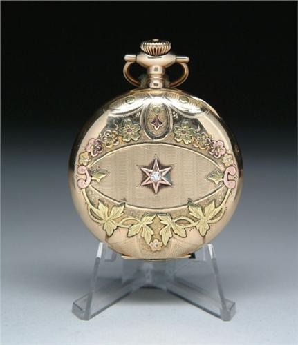 16 SIZE ELGIN POCKET WATCH. 21 jewel, Father Time in a multicolor gold filled hunting case. SN 16205188. Possibly having a diamond in center of case. Double sunk Elgin railroad style dial with hairlines. CONDITION: Very good, running. 9-25844