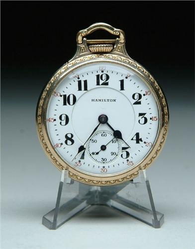 16 SIZE HAMILTON POCKET WATCH. Grade 950B. 23 jewels. SN S18938. Hamilton gold filled case, porcelain Hamilton double sunk dial in very nice condition. CONDITION: Very good, running. 9-25868