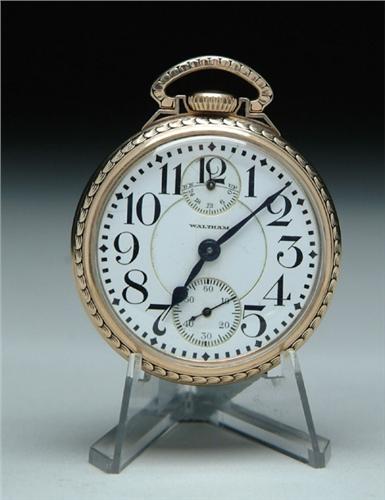 16 SIZE WALTHAM POCKET WATCH. 23 jewel Vanguard. Lossier inner terminal hair spring. SN 25341125. Monogrammed Waltham railroad case. Original porcelain indicator dial with hairline. CONDITION: As noted above, running. 9-25939