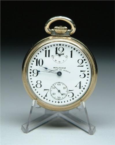 16 SIZE WALTHAM POCKET WATCH. 23 jewel Vanguard wind indicator. Waltham railroad case. CONDITION: Balance is good but does not seem to run. Replaced Waltham Vanguard wind indicator dial. Good. 9-25928