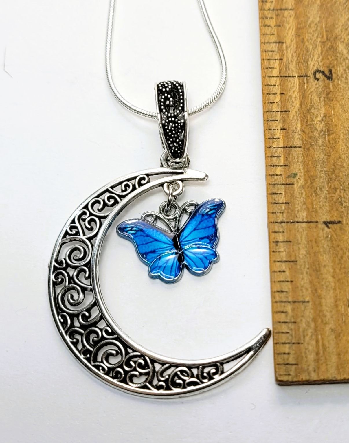 MOON WITH BLUE ENAMEL BUTTERFLY ON A 20" SNAKE CHAIN. JEWELRY