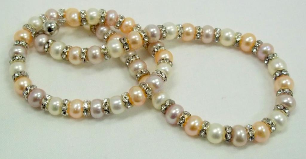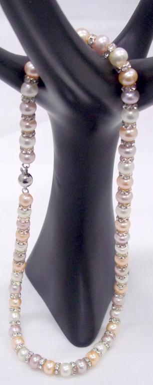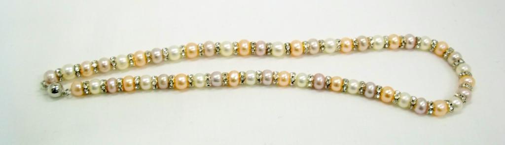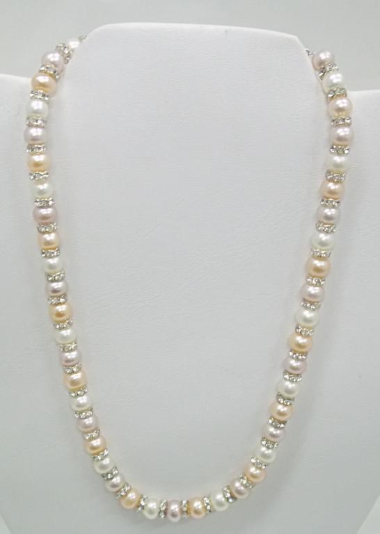 This beautiful single strand necklace is strung with 8mm tri colored fresh water pearls and accented with roundells for a one of a kind look. The retail value is $880-.